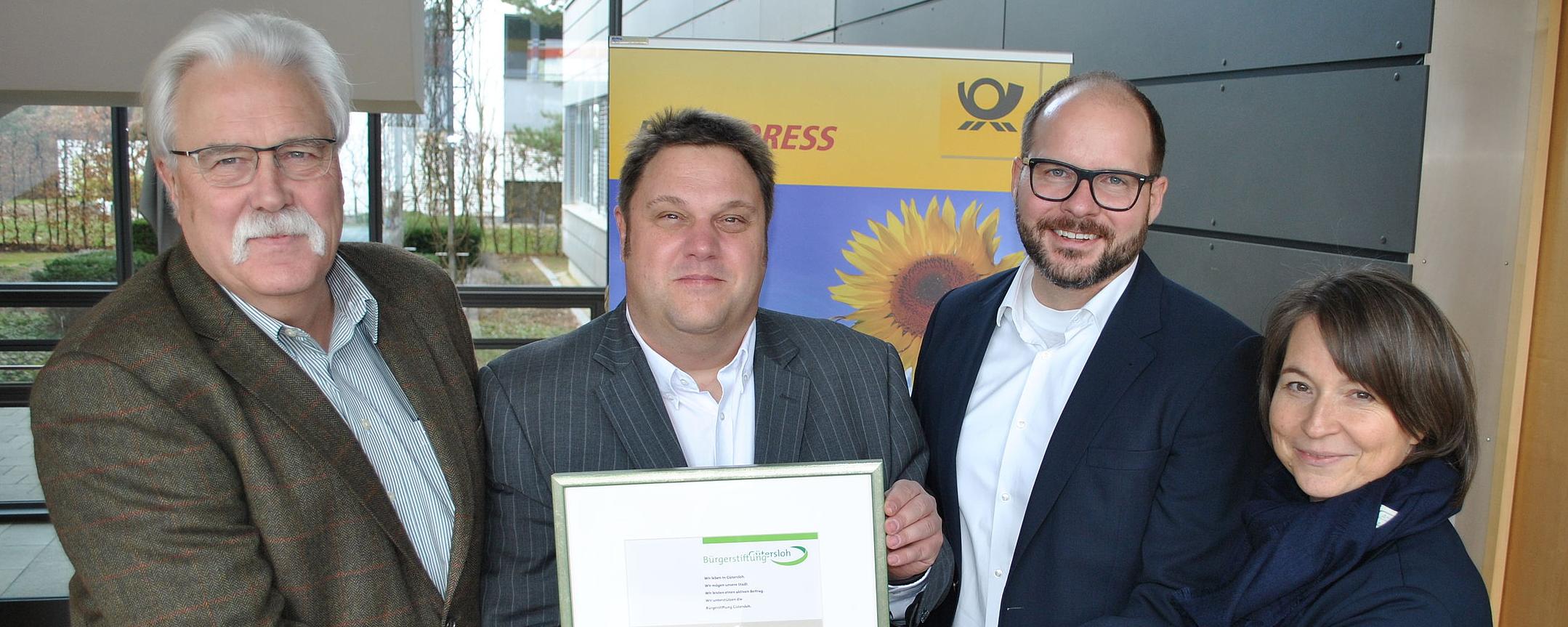 Bildzeile: Gemeinsam für Gütersloh (v.l.): Nina Spallek (Geschäftsführung Bürgerstiftung), Prof. Dr. Manfred Varney (Vorstand Bürgerstiftung), Carsten Bohnen und Anselm Börs (beide Unternehmensführung Post Adress) freuen sich über die goldene Patenschaft