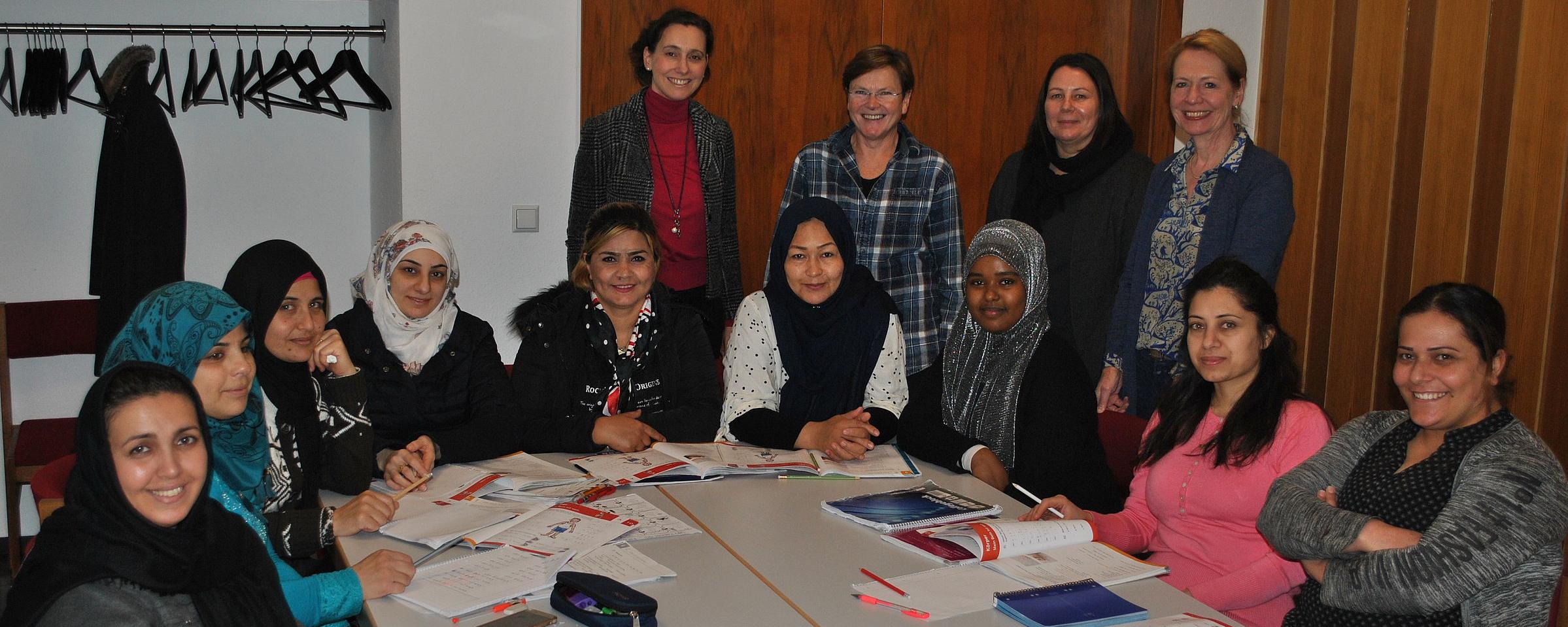 Bildzeile: Gefördert durch die Bürgerstiftung Gütersloh. Der Mütterkurs der Volkshochschule Gütersloh soll den geflüchteten Müttern beim Ankommen in Gütersloh helfen: (Hintere Reihe) Katrin Meyer (Bürgerstiftung Gütersloh), Ingrid Müller (Landeskirchliche Gemeinschaft), Susanne Pollmeier (Stadt Gütersloh), Antje Acainas (VHS) und die Teilnehmerinnen des Sprachkurses (vordere Reihe).