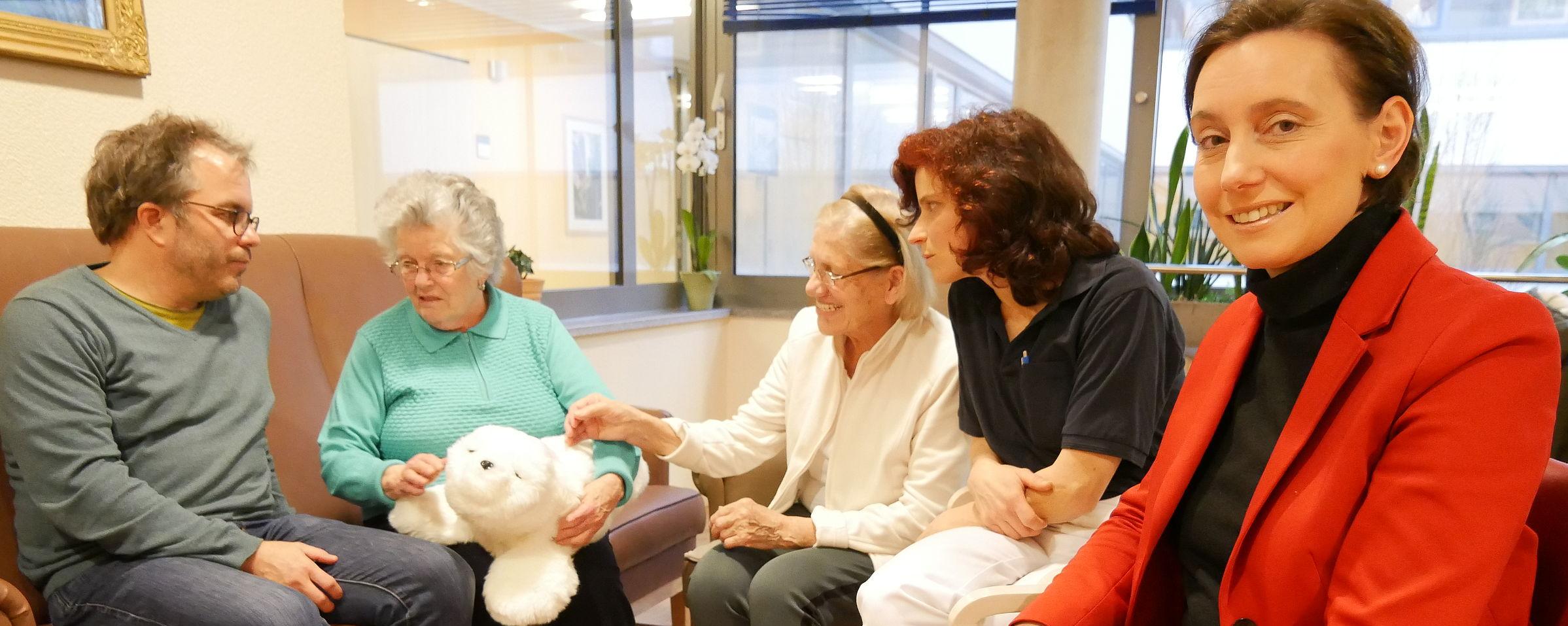 Die Bürgerstiftung Gütersloh hat für die Betreuung von Demenz-Patienten die Anschaffung eines Tierroboters ermöglicht. Katrin Meyer (Bürgerstiftung, 1. v. l.) sammelt Eindrücke der Arbeit, von der Ergotherapeutin Kati Hinz (LWL-Klinikum, 2.v.l.) und Chefarzt Bernd Meißnest berichten. Die Patientinnen Helga Baldenau und Edith Jasperneite verbringen Zeit mit der Robbe Paro.