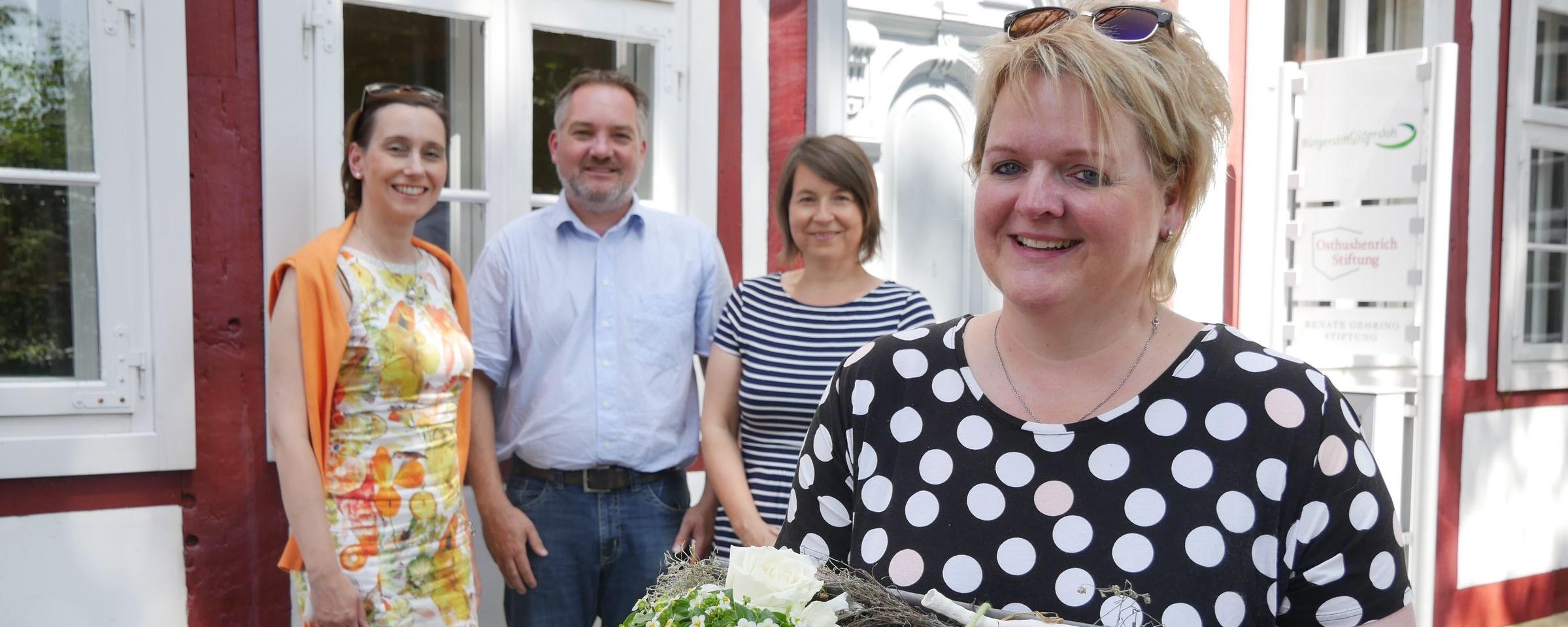 Dank für Unterstützung: Barbara Zander hat mit Hilfe der Bürgerstiftung Gütersloh eine Ausbildung zur Genesungsbegleiterin für psychisch Erkrankte gemacht. Zum erfolgreichen Abschluss gratulieren (v. l.) Katrin Meyer (Bürgerstiftung), Prof. Dr. Michael Löhr (LWL-Klinikum) und Nina Spallek (Bürgerstiftung).