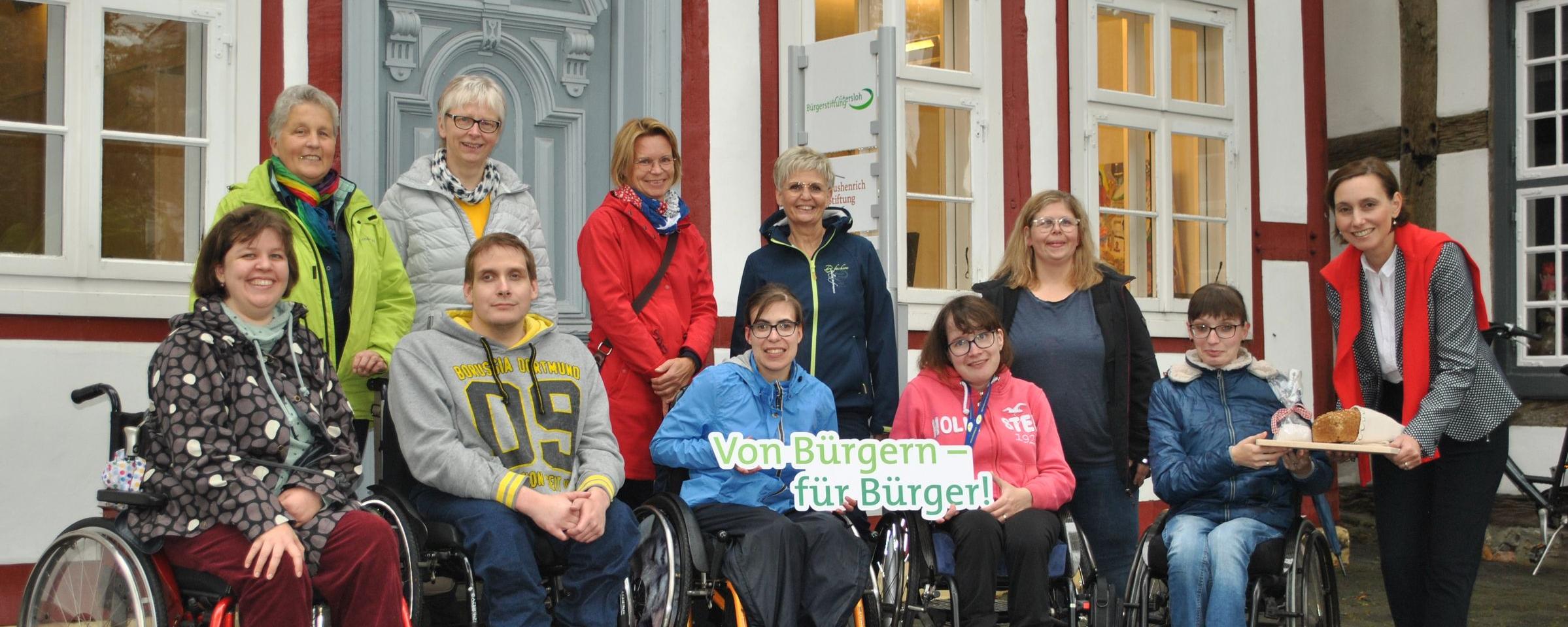 Fotozeile:  Über Brot und Salz zum Einzug freuen sich: (hinten,v. l.) Rita Westbomke, Elisabeth Grave, Karin Stüker, Birgit Dreisilker, Kristin Dreisilker, Katrin Meyer (Bürgerstiftung Gütersloh) (unten, v. r.) Marie Westbomke, Michael Grave, Elena Brandt, Jana Stüker und Julia Rempe