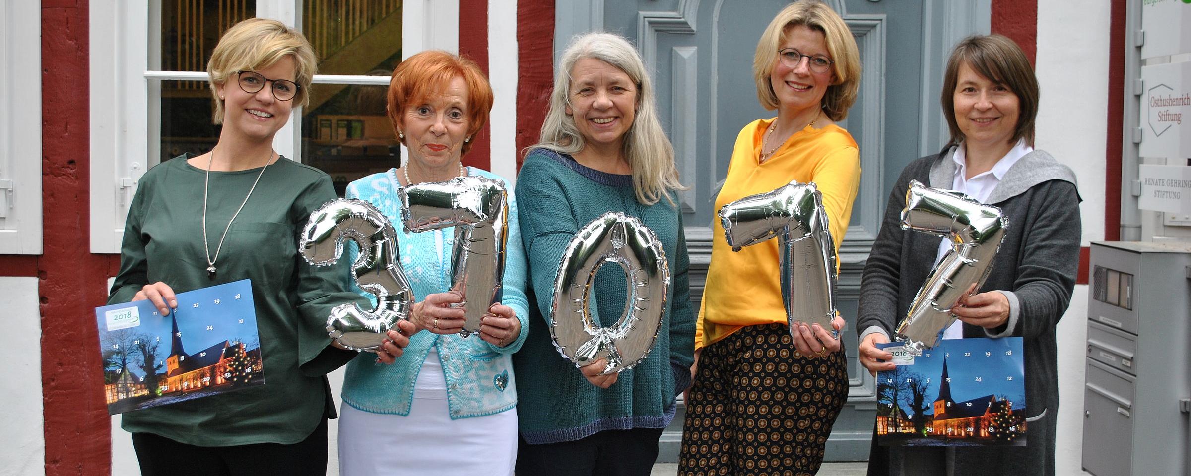 31.017 Euro: Der Erlös des Adventskalenders 2017 kommt dem BürgerKolleg Gütersloh zugute. Brigitte Büscher, Brigitta Resch, Corinna Nagels, Katja Soehnle-Miele und Nina Spallek danken allen Sponsoren, Helfern und Beteiligten und präsentieren bei dieser Gelegenheit schon das Motiv 2018.