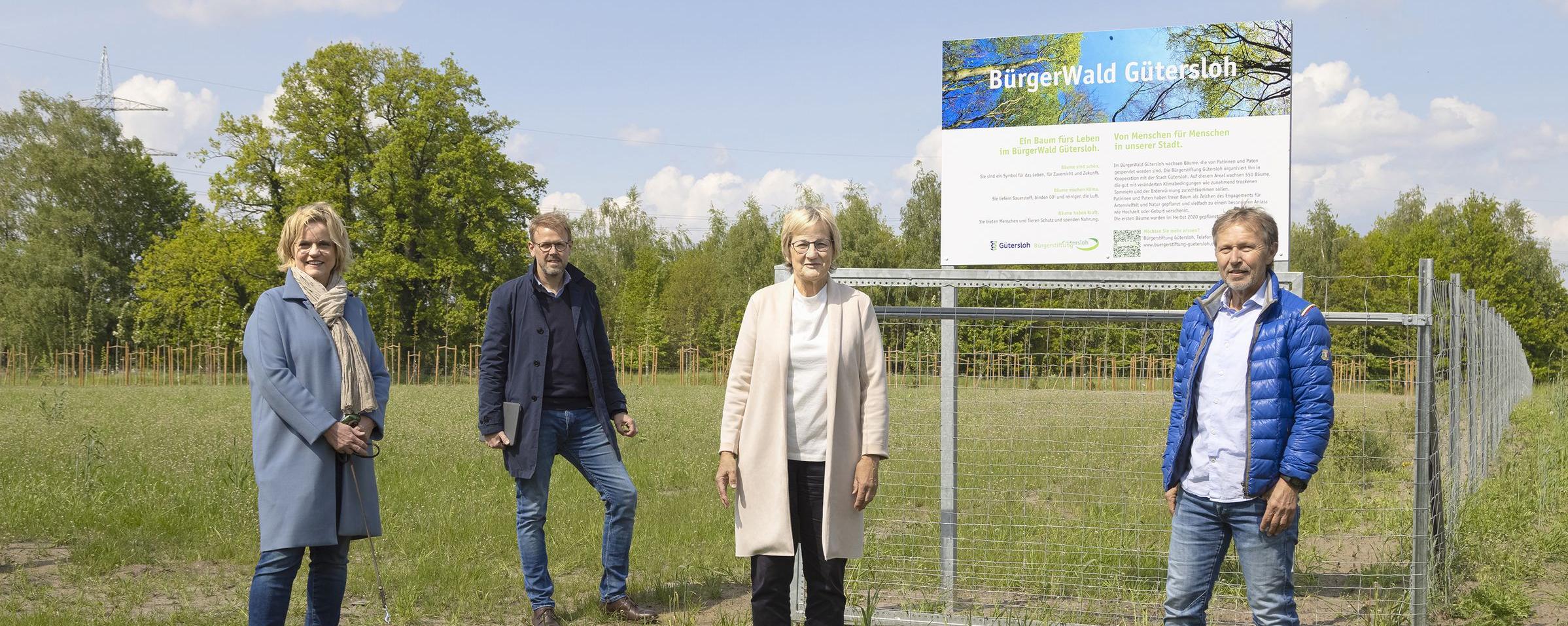 Einladung zur Baumpatenschaft: Dirk Buddenberg (Stadt Gütersloh), Brigitte Büscher, Susanne Otter-Nacke und Reinhard Wagener (Bürgerstiftung, v.l.) freuen sich auf eine neue Saison im BürgerWald.