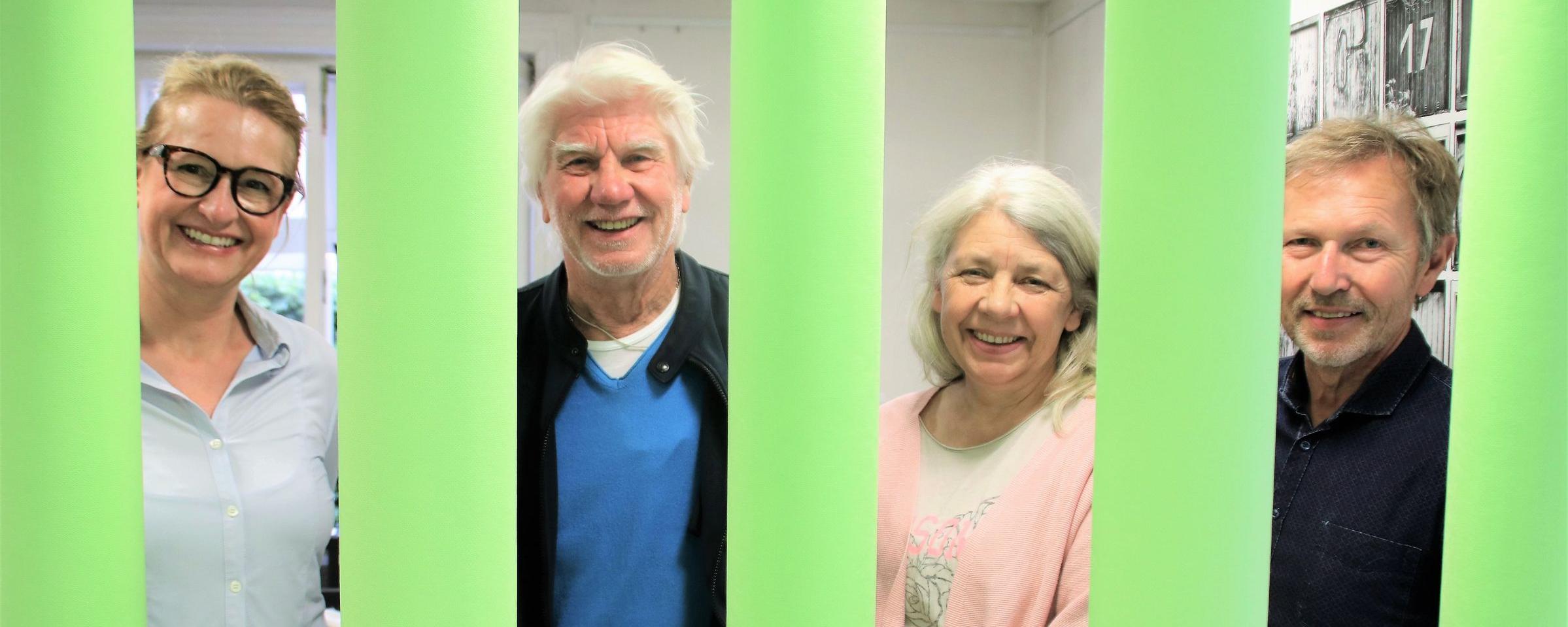 Es grünt so grün: (von links) Petra Falkenreck, Siegmund Bergemann, Corinna Nagels und Reinhard Wagener vom Orga-Team der Bürgerstiftung schneiden aus großen grünen Vliesrollen passende Tischdecken zu für die Frühstückstische zum BürgerBrunch am Sonntag, 12. Juni auf dem Berliner Platz in Gütersloh.