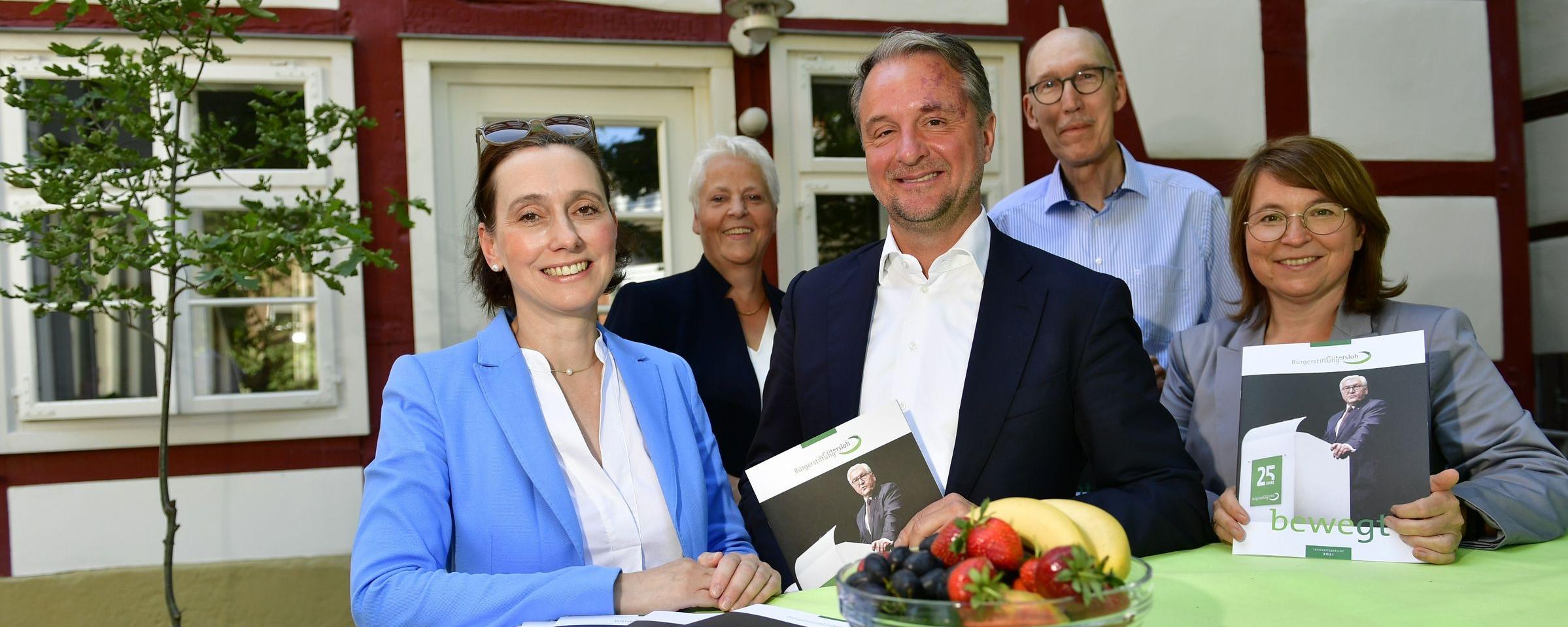 Strahlende Gesichter: In ihrem Jubiläumsjahr 2021 hat die Bürgerstiftung Gütersloh Projekte mit der Rekordsumme von 531.000 Euro gefördert. Nähere Details verrieten (vorn) Vorstandsvorsitzende Katrin Meyer und der stellvertretende Kuratoriumsvorsitzende Dr. Immanuel Hermreck sowie (hinten v. l.) die Vorstandsmitglieder Doris Pieper(Öffentlichkeitsarbeit). Dr. Reinhard Liedl (Finanzen) und Geschäftsführerin Nina Spallek.