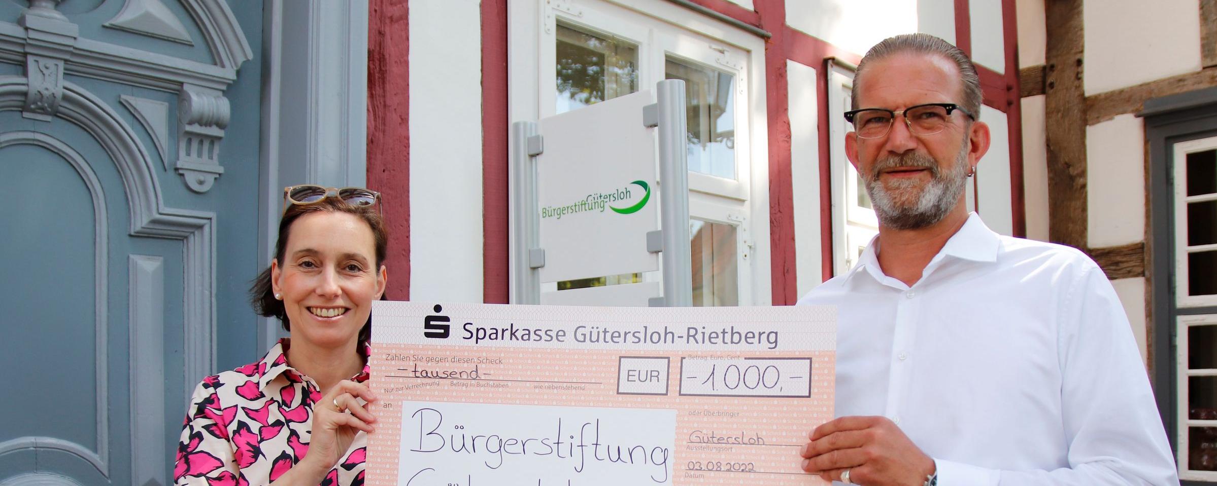 Die Gütersloh Marketing GmbH (gtm) hat in den vergangenen Monaten im Rahmen ihrer Veranstaltungen Spenden zur Unterstützung von geflüchteten Menschen gesammelt. Der Erlös kommt nun dem Fonds „Engagement für Flüchtlinge“ zugute, mit dem die Bürgerstiftung Gütersloh Projekte für und mit Flüchtlingen vor Ort fördert: gtm-Geschäftsführer Jan-Erik Weinekötter überreichte jüngst einen 1.000-Euro-Scheck an die Vorstandsvorsitzende der Bürgerstiftung, Katrin Meyer.