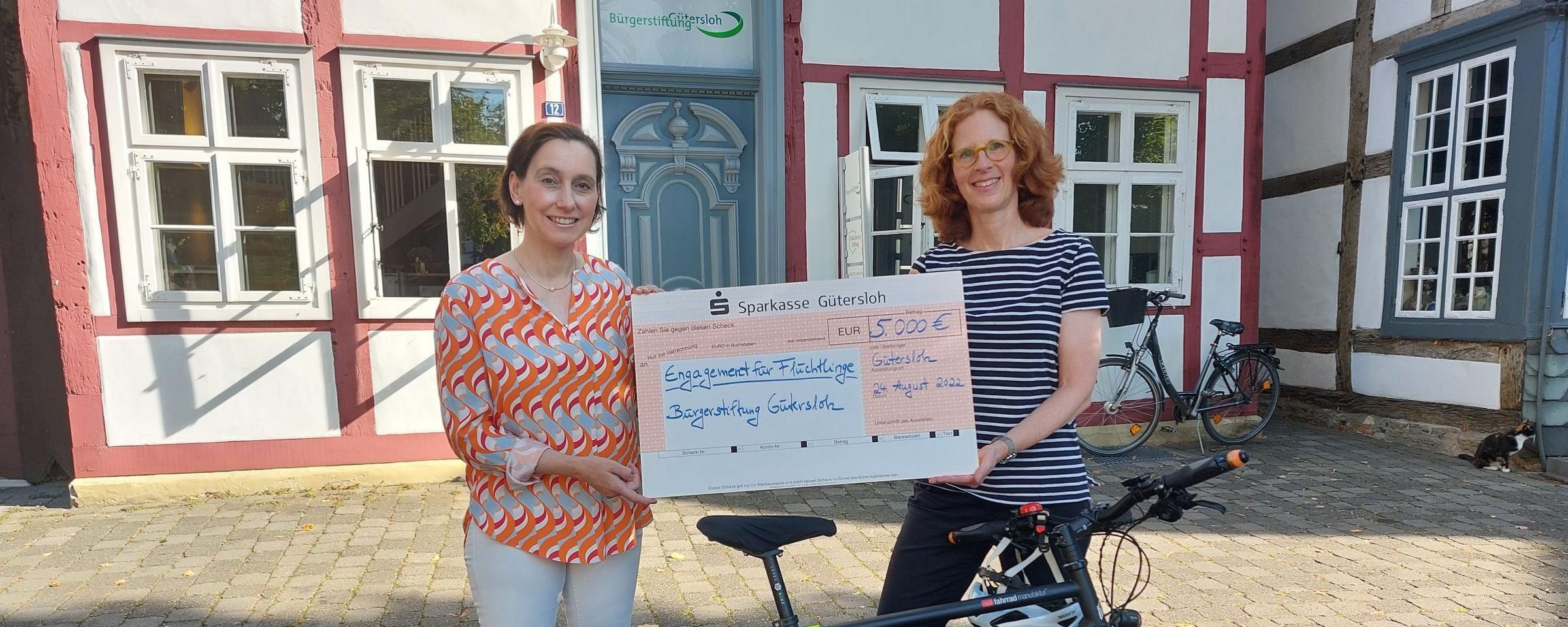 5.000 Euro für den Spendenfonds „Engagement für Flüchtlinge“ der Bürgerstiftung. Deren Vorstandsvorsitzende Katrin Meyer (links) nahm den Scheck von Anja Friese, Betriebsrätin der Bertelsmann Stiftung, entgegen. Das Geld stammt aus der Gesundheitsaktion „Fit for Work“, bei der die Mitarbeiter der Bertelsmann Stiftung drei Monate lang Kilometer „gesammelt“ haben.