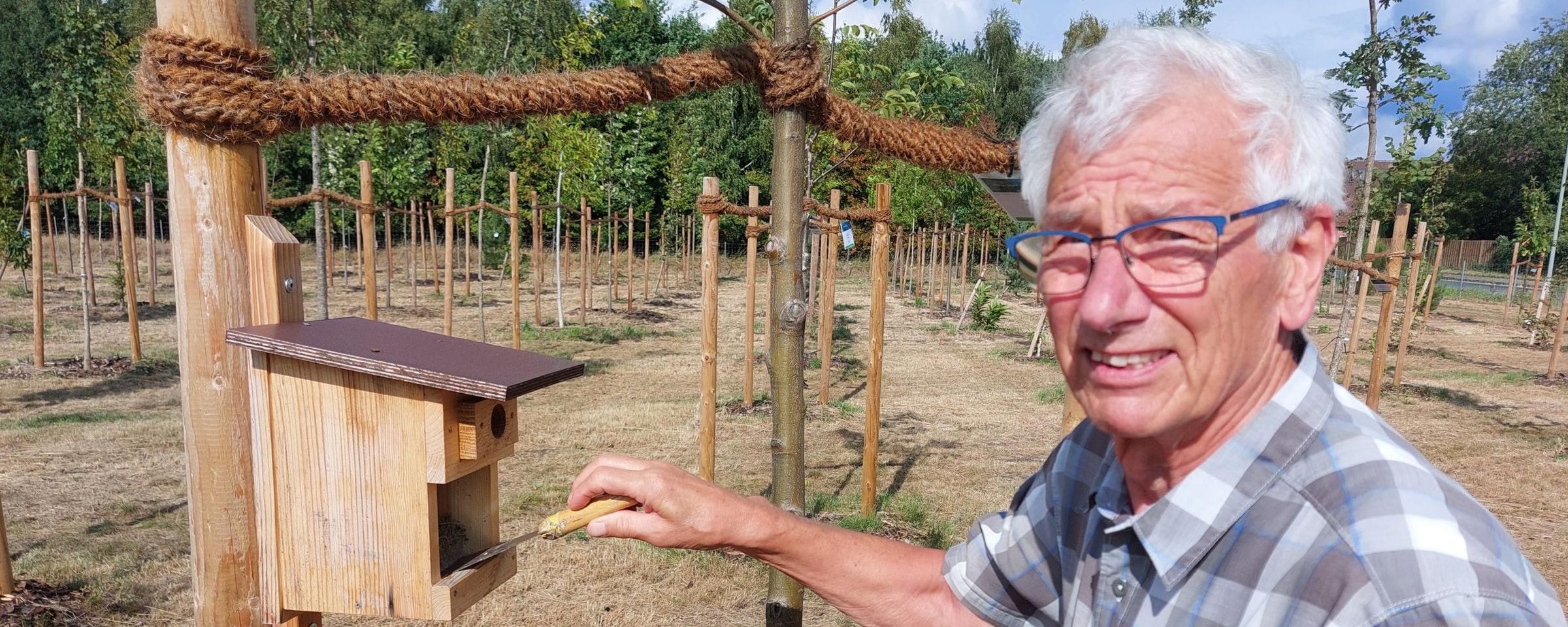 Ob Ahorn oder Buche, ob Eiche oder Walnuss, die jungen Bäume haben sich gut entwickelt und bereits manchen Bewohner angezogen. Naturfreund Horst Domass, der als Pate an seinen drei Bäumen im Frühjahr Nistkästen angebracht hatte, berichtete freudestrahlend, dass sie gleich von Meisen bezogen worden seien. Den Tag der offenen Tür hat er dazu genutzt, die Kästen zu reinigen. „Jetzt im Spätsommer ist genau der richtige Zeitpunkt, um die übrig gebliebenen Reste des Nestes zu entfernen, so dass die Vögel einerseits bei Kälte im Winter dort wieder Schutz finden können, andererseits in der folgenden Brutsaison erneut darin brüten können, ohne Probleme mit zurück gebliebenem Ungeziefer oder Parasiten zu bekommen“, erklärte er fachmännisch. Weitere Nistkästen sollen folgen, denn der Gütersloher „Wald der Zukunft“ steht nicht nur in Bezug auf klimaresiliente Pflanzen, sondern auch mit Blick auf den Lebensraum für Vögel und Insekten für Biodiversität.