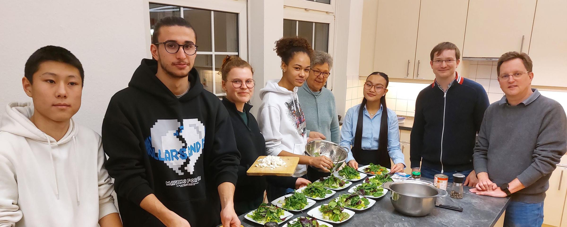 Foto: Mit 7.000 Euro unterstützt die Firma Sewerin die „Aufwind“-Stipendiaten der Bürgerstiftung Gütersloh. Beim jüngsten Koch-Event in der VHS-Küche lernte man sich kennen: (v. l.) Margad Ganbold, Maher Darweesh, Katharina Horsthemke, Promise Nnodim, Mentorin Ingrid Tiedtke-Strandt, Nazila Rezaie sowie die Unternehmer und Geschäftsführer Benjamin und Dr. Swen Sewerin.