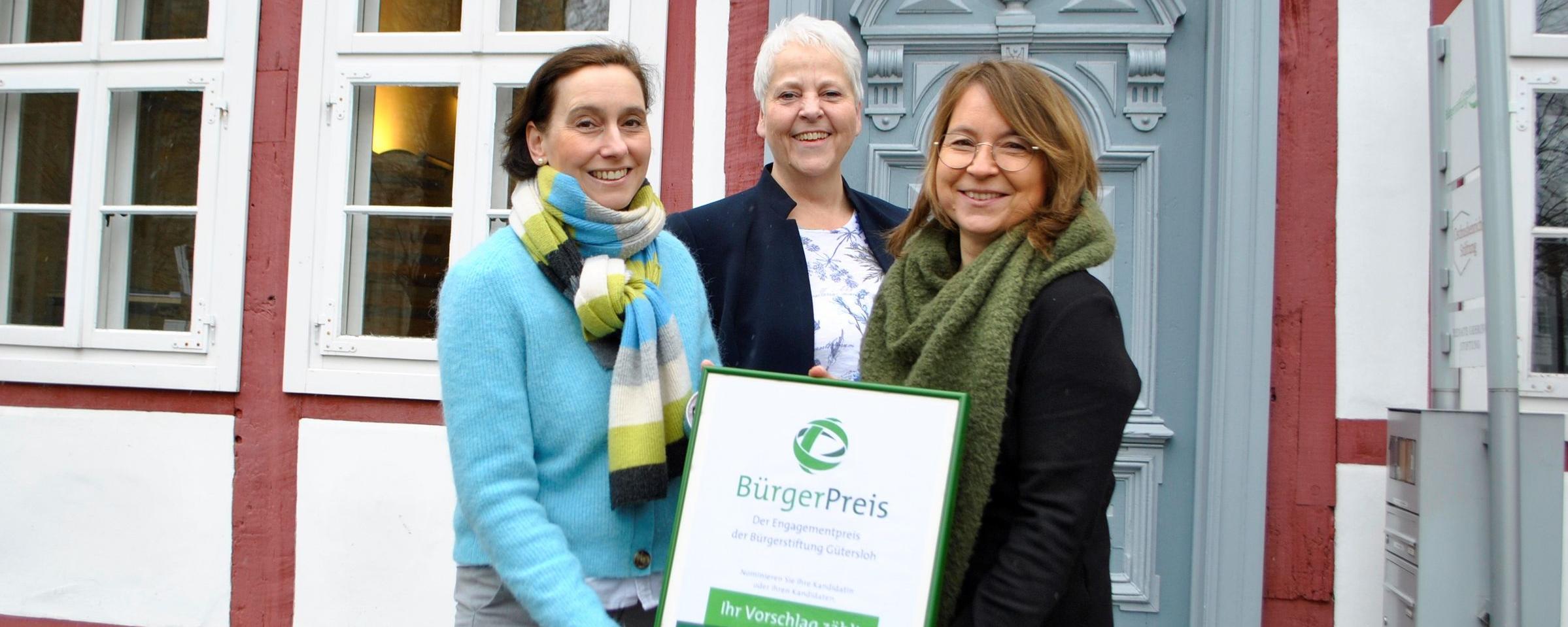Foto: Jeder Vorschlag zählt beim neuen „BürgerPreis“ der Bürgerstiftung Gütersloh. Die mit 5.000 Euro dotierte Auszeichnung soll besonderes Engagement würdigen. Katrin Meyer, Vorsitzende der Stiftung, Vorstandsmitglied Doris Pieper und Geschäftsführerin Nina Spallek freuen sich auf eine hoffentlich reiche Bürgerbeteiligung.