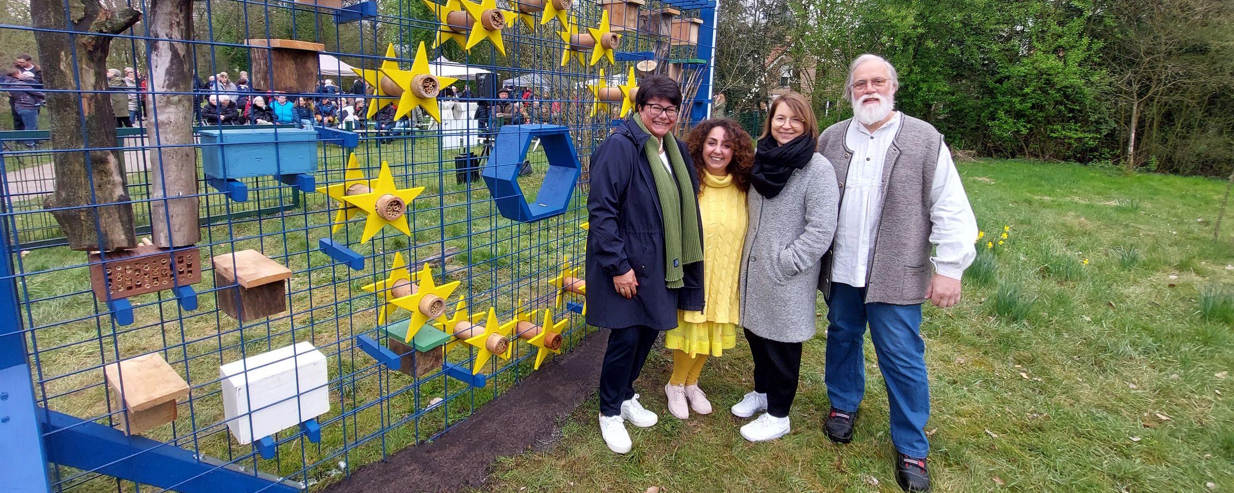 Bild: Am Anfang von Europas Künstlerweg: (v.l.) EU-Parlamentarierin Sabine Verheyen, Aktionskünstlerin Nirgül Kantar Dreesbeimdieke, Nina Spallek, Geschäftsführerin der Bürgerstiftung Gütersloh und Rainer Bethlehem vom Imkerverein Isselhorst, der die Europaskulptur für Wildbienenvölker als Beitrag zu Nirgüls Großprojekt schuf.