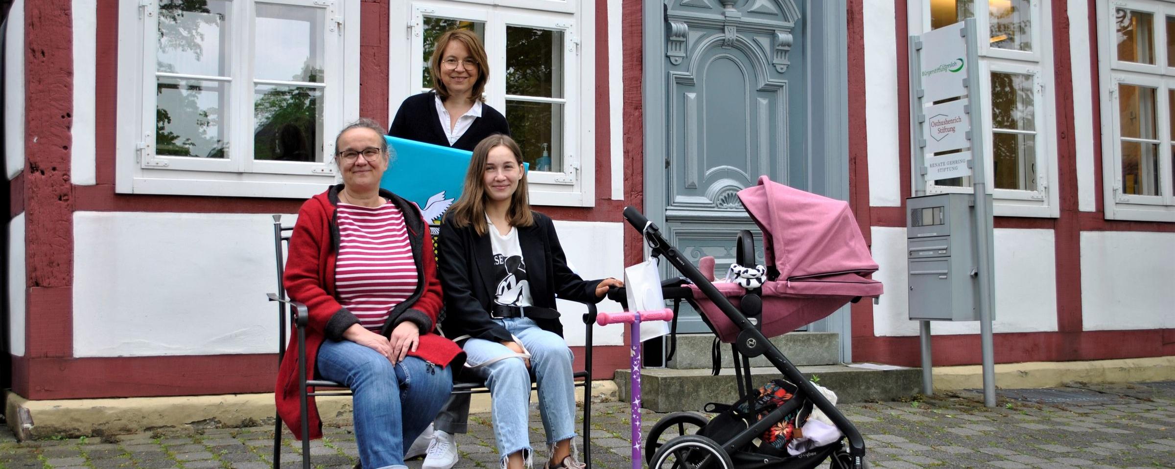 Im Verlauf des Projekts verlief die Entwicklung der Wohnungsangebote zur Nachfrage diametral: Weil viele Flüchtlinge anfangs noch davon ausgingen, dass ihr Aufenthalt in Deutschland nur kurz sei und sie bald in ihre Heimat zurückkehren könnten, war die Nachfrage gering. Als die Nachfrage nach privatem Wohnraum im Laufe der Zeit stieg, stagnierten aber die Wohnungsangebote. Insgesamt wurden 25 Wohnungen angeboten und es gab 11 erfolgreiche Vermittlungen – darunter für Yelyzayeta O., die sich darüber zusammen mit Katharina Stein (links) von der Flüchtlingsberatung der Diakonie und Nina Spallek (hinten), Geschäftsführerin der Bürgerstiftung Gütersloh freut.