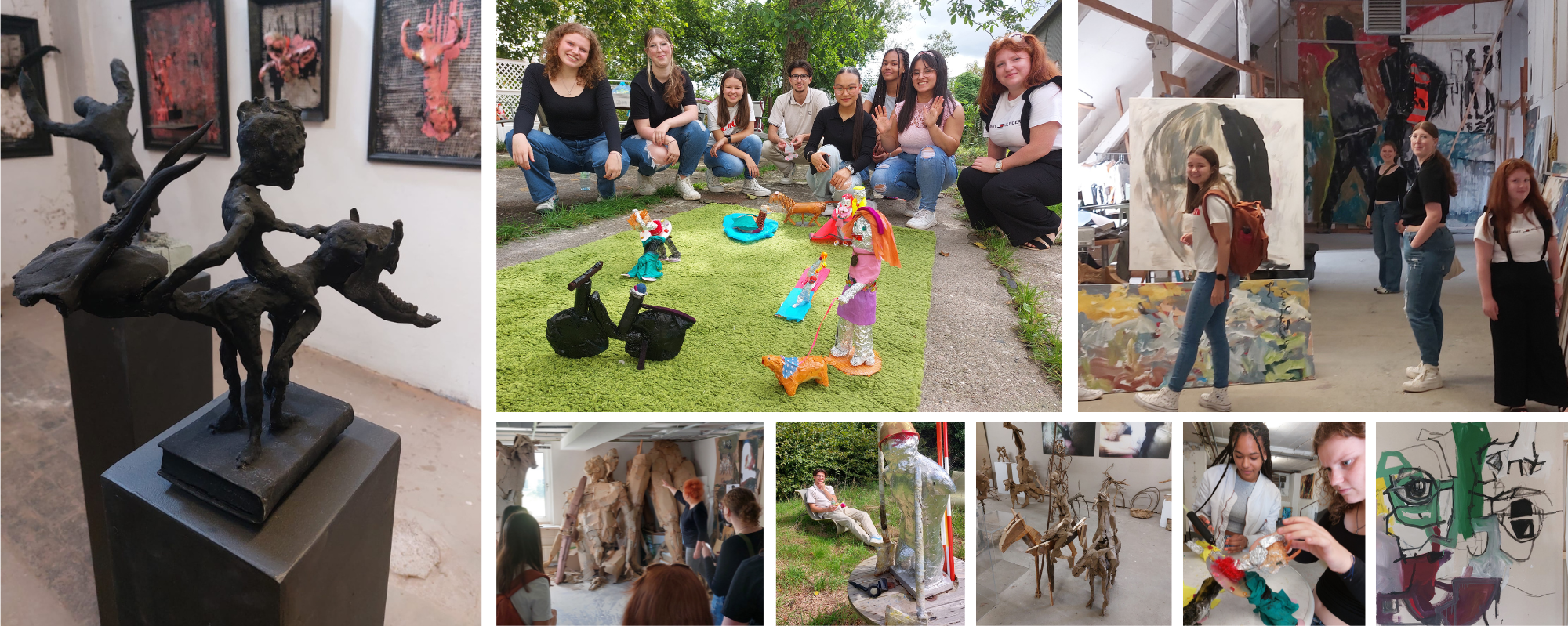 Nach ausgiebiger und sehr interessanter Führung durch alle Ateliers mit der dort ansässigen Künstlerin Beate Freier-Bongaertz waren die Jugendlichen mehr als motiviert und inspiriert, um selbst kreativ tätig zu werden. Gemeinsam schufen sie aus den unterschiedlichsten Materialien individuell gestaltete Figuren, die am Ende ein buntes Stadtpark-Szenarium ergaben. Ein anregendes Miteinander – sowohl als Gesamtkonstellation als auch im Schaffensprozess, der den Stipendiat*innen ganz offensichtlich viel Spaß machte und den Teamgeist förderte.