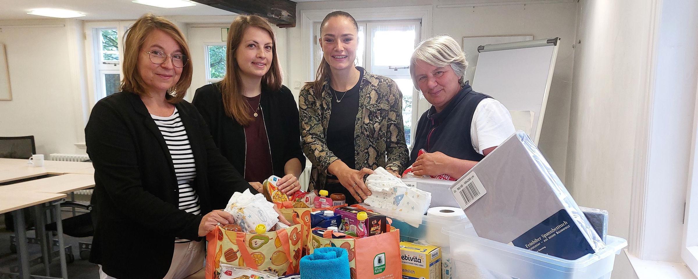 Starthilfe für ein neues Leben: Mit den von der Bürgerstiftung finanzierten Willkommenspaketen gewährt das Gütersloher Frauenhaus den Zuflucht suchenden Frauen eine erstversorgende Hilfe zur Selbsthilfe. (V. l.) Nina Spallek, Geschäftsführerin der Bürgerstiftung, sowie die Mitarbeiterinnen des Frauenhauses Meike Hoffmann, Pia Kugis-Johannknecht und Petra Strauss.