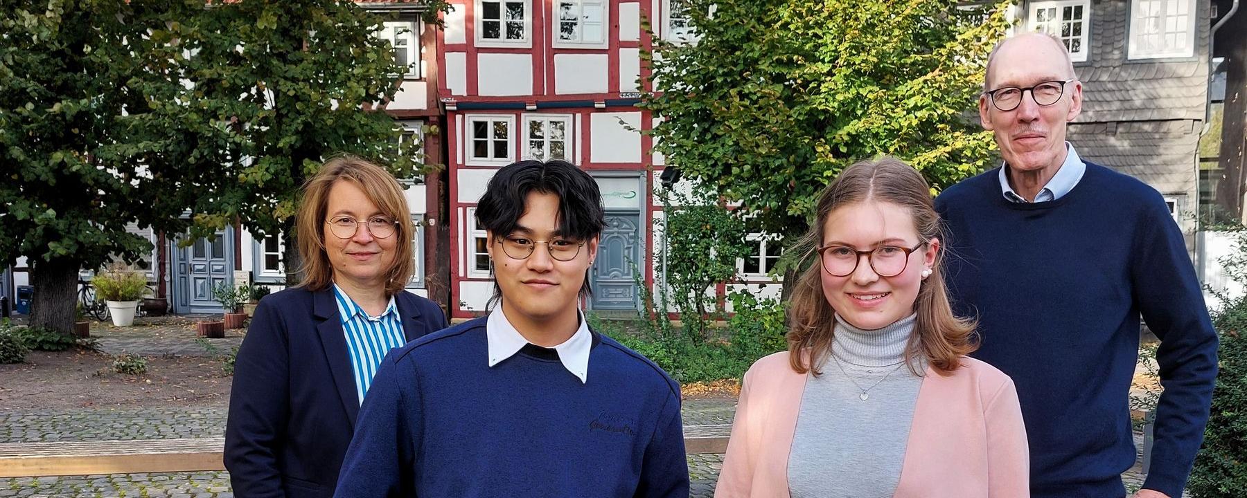 Foto: Leistungswillige junge Gütersloher: Leon Liu und Amelie Becker sind die neuen, von der Bürgerstiftung Gütersloh unterstützten Deutschlandstipendiaten des Studienfonds OWL. Hier mit Stiftungs-Geschäftsführerin Nina Spallek und Stiftungsvorstand Dr. Reinhard Liedl.