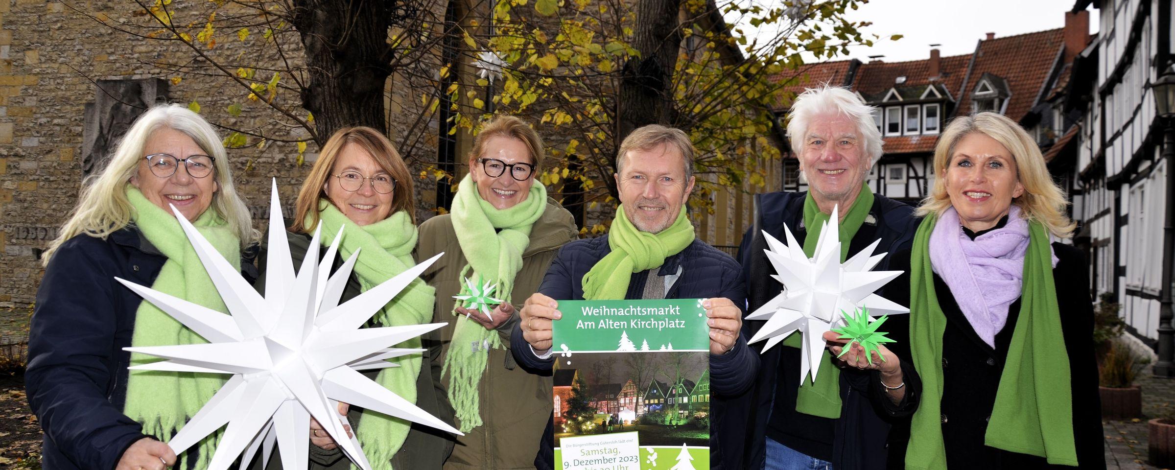 Das „WM-Team“ der Bürgerstiftung lädt ein: (v. L.) Corinna Nagels, Geschäftsführerin Nina Spallek, Petra Falkenreck, Reinhard Wagner, Siegmund Bergemann und Barbara Bierfischer organisieren den atmosphärischen Weihnachtsmarkt für den guten Zweck am Samstag, 9. Dezember, Am Alten Kirchplatz.