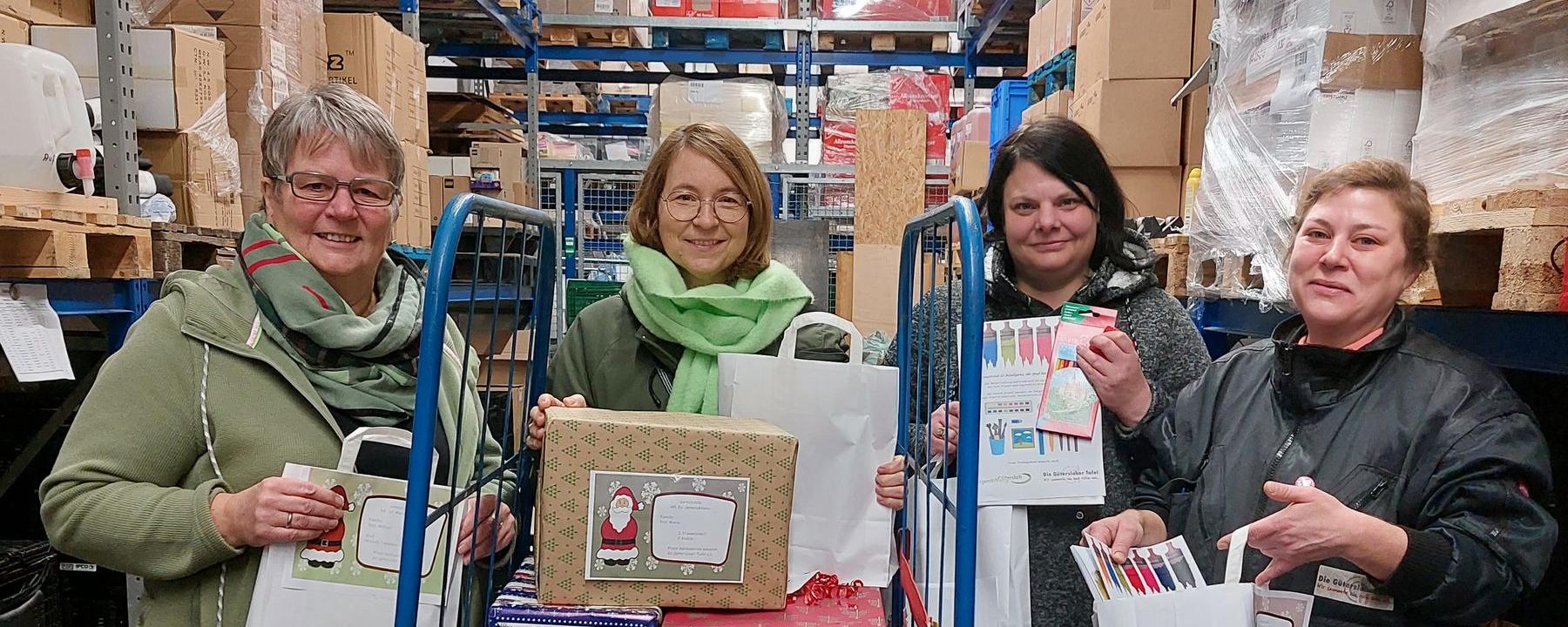 Weihnachten kann kommen: Dank Unterstützung der Bürgerstiftung konnten 830 Weihnachtstüten für Kinder und Jugendliche bedürftiger Familien gepackt werden. Beim Besuch im Zentrallager überzeugten sich (v. l.) Tafel-Geschäftsführerin Ruth Prior-Dresemann, Bürgerstiftungs-Geschäftsführerin Nina Spallek sowie die ehrenamtlichen Helferinnen Daniela Mische und Rafaela Pauli, dass alles fertig ist.