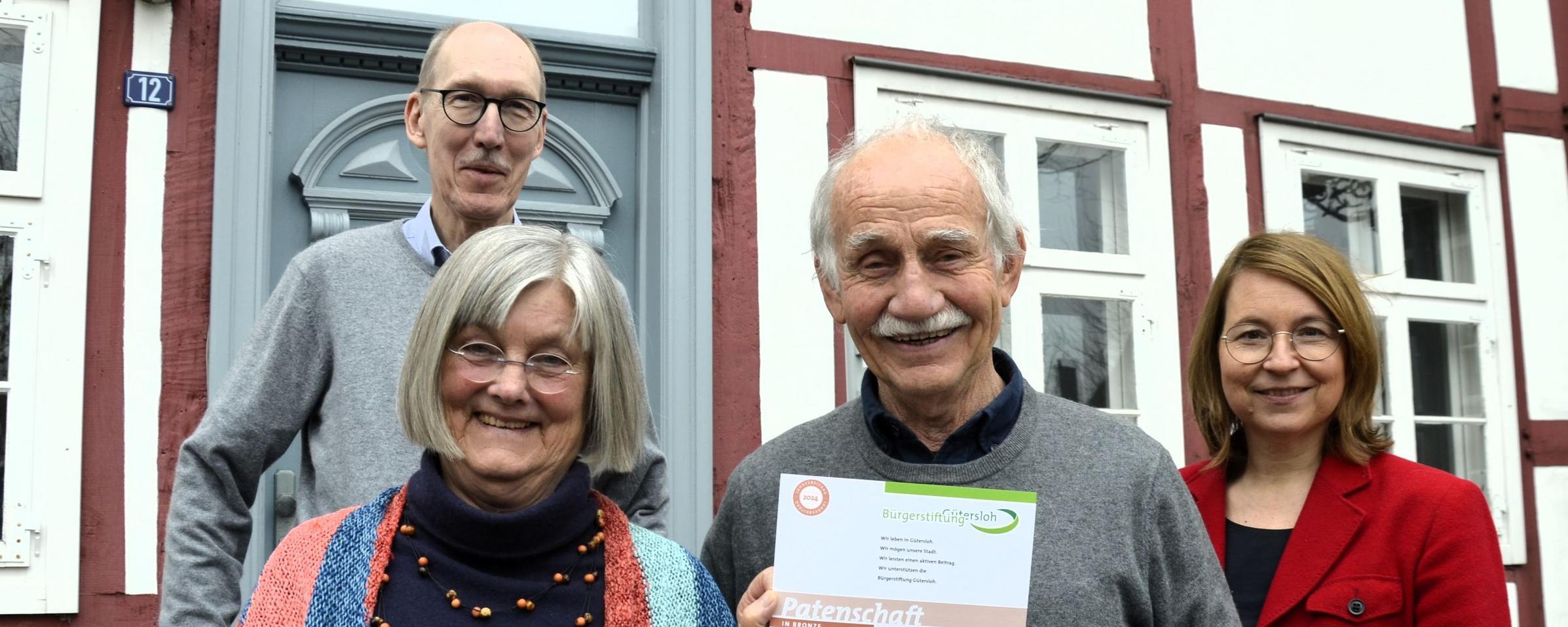 Neue Paten für die Bürgerstiftung Gütersloh: Marita und Rainer Stumpe (vorn) bekamen ihre Urkunde vom Vorstandsmitglied der Bürgerstiftung Dr. Reinhard Liedl (links) und Geschäftsführerin Nina Spallek (rechts) überreicht.