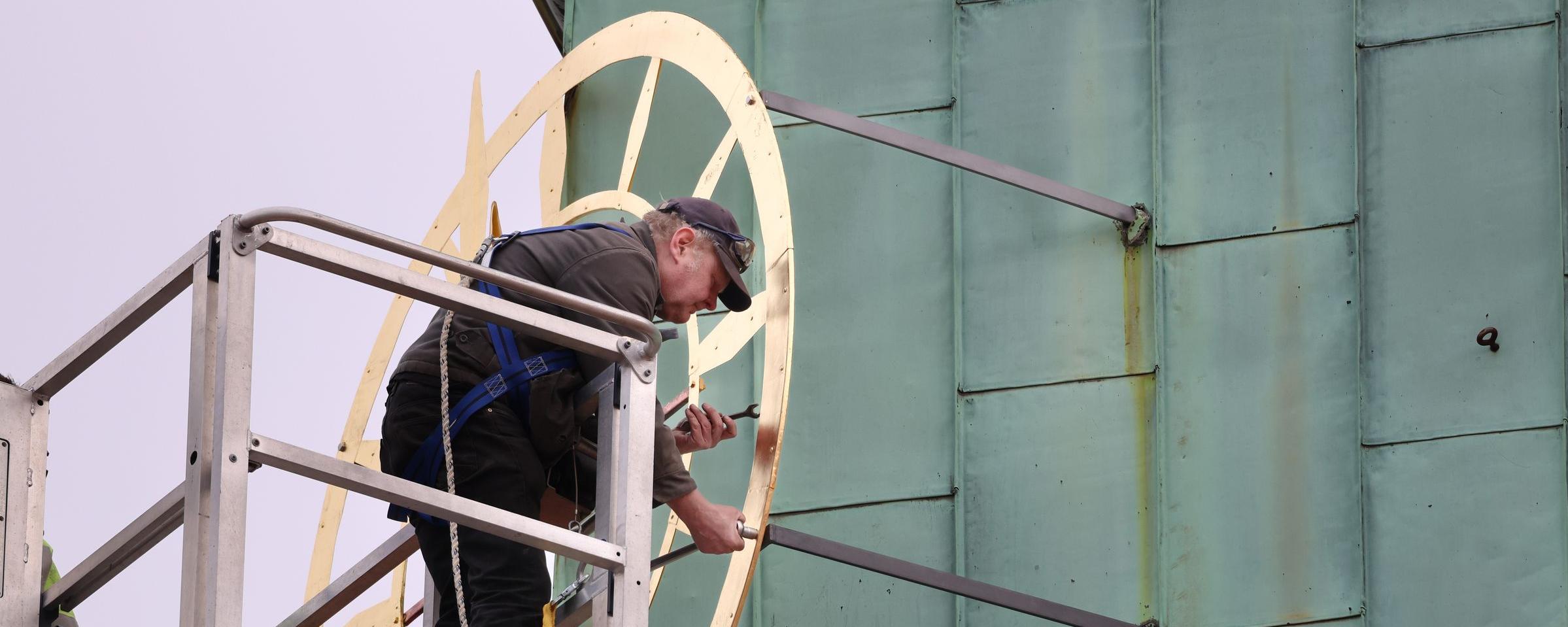 Hoch hinaus treibt es Metallbauer Peter Lachmann und seinen Kollegen bei der Montage des gereinigten Zifferblatts am Evangelisch Stiftischen Gymnasium.