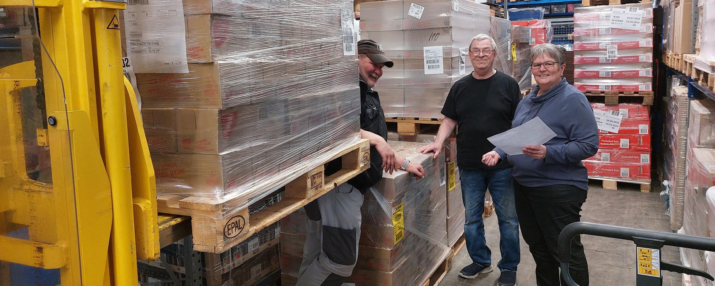 Foto: 23 Paletten voller Lebensmittel gegen die akute Not: (v.l.) Fahrer Georg Bauch, Mitarbeiter Peter Ablass und Ruth Prior-Dresemann, Geschäftsführerin der Tafel, freuen sich, dass die Bürgerstiftung Gütersloh diese Sonderlieferung ermöglicht hat.