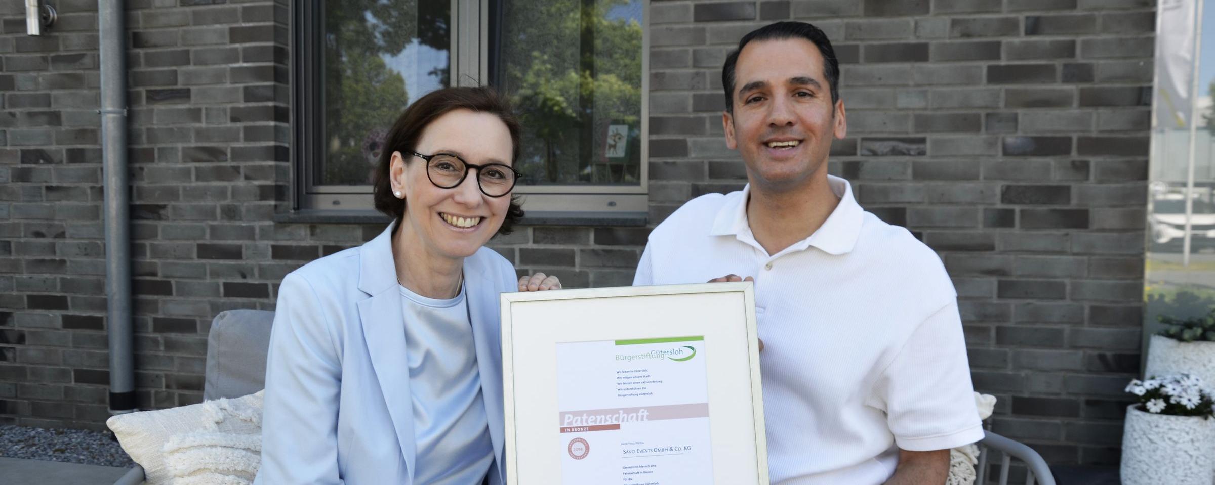 Neu im Kreis der Bürgerstiftungspaten: Orhan Savci, Inhaber des gleichnamigen Catering- und Eventunternehmens, bekam von Katrin Meyer, Vorstandsvorsitzende der Bürgerstiftung, die Patenurkunde überreicht.