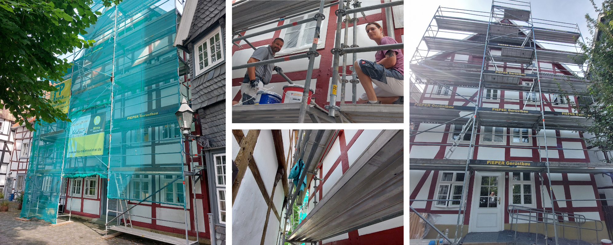 Malerin und Lackiererin Melanie Heinze sowie ihr Kollege Jörg Winkler sind eifrig bei der Arbeit. Die Fassade wurde zunächst von Algen und Schimmelsporen gereinigt. Ein typischer Befall, der durch die großen Bäume vor dem Haus begünstigt wird. Loser Putz wurde abgekratzt und fachmännisch erneuert. Beschädigungen an der Sockelfläche werden repariert. Die farbig gefassten Inschriften, Jahreszahlen und Verzierungen sowie die sogenannten Knaggen – kleine Konsolen im Bereich der oberen Geschosse – werden nachgemalt. Bald strahlen die Balken wieder in Ochsenblutrot und die Gefache in Weiß. Alle Arbeiten sind mit Ulrich Paschke, Güterslohs Denkmalpfleger vom Fachbereich Stadtplanung, abgesprochen.