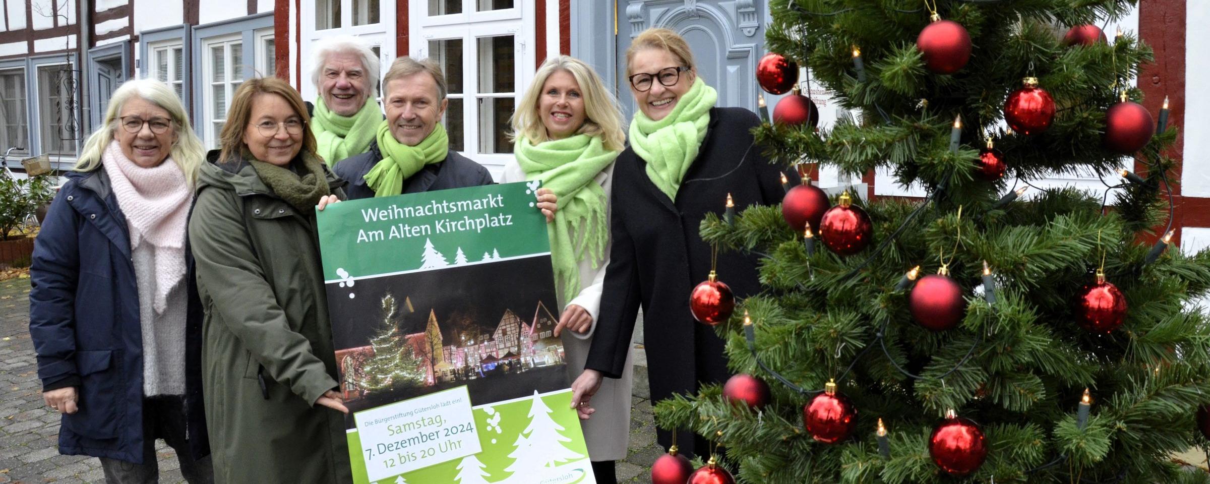 Das „WM“-Team der Bürgerstiftung Gütersloh lädt ein: Am Samstag, 7. Dezember, findet von 12 bis 20 Uhr wieder der Weihnachtsmarkt für den guten Zweck rund um die Apostelkirche statt (v. l.) Corinna Nagels, Geschäftsführerin Nina Spallek, Siegmund Bergemann, Reinhard Wagener, Barbara Bierfischer und Petra Falkenreck freuen sich auf die Besucher.