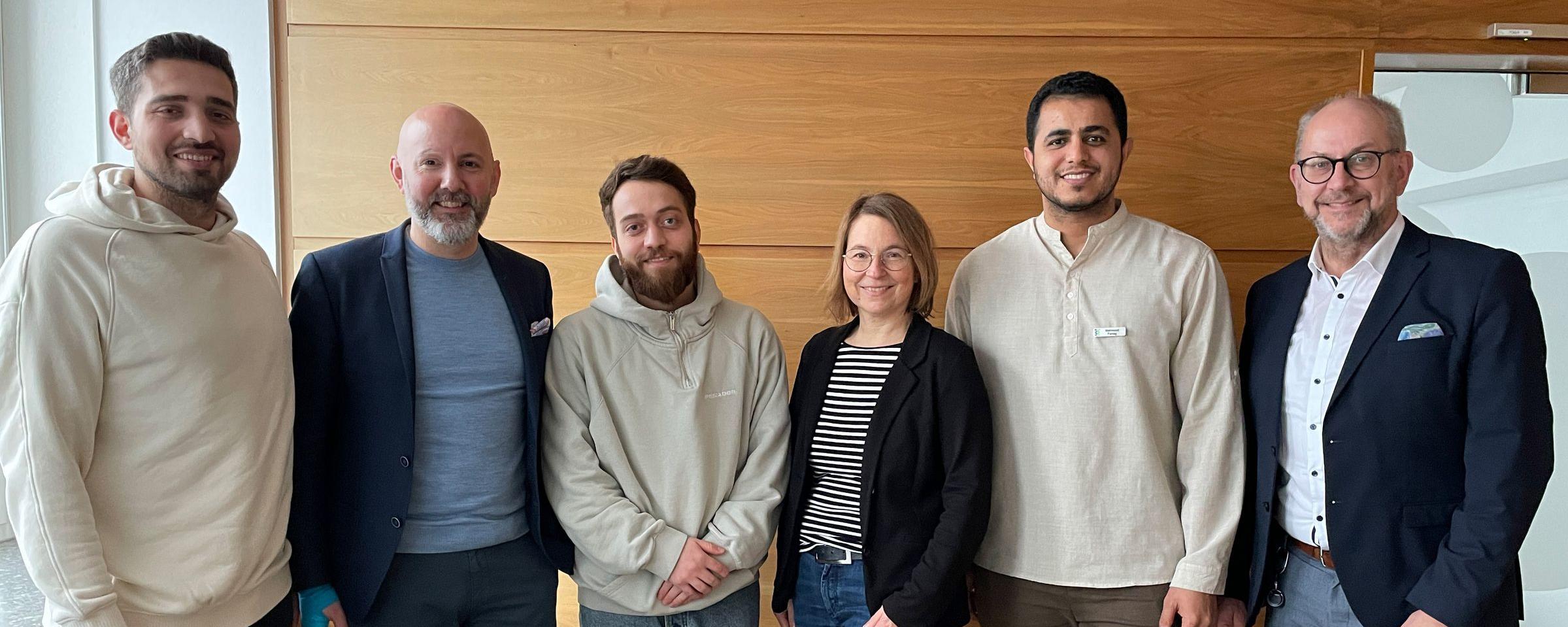BU: Kamen im Rathaus zusammen, um eine positive Bilanz zum Projekt „Erste Schritte – Sprachfördermaßnahmen für Geflüchtete“ zu ziehen: (v.l.) Eris Altun (Teilnehmer Sprachkurs), Henning Matthes (Beigeordneter für den Bereich Familie, Jugend, Schule, Soziales und Sport), Jamalikhabir Peyman (Teilnehmer Sprachkurs), Nina Spallek (Geschäftsführerin der Bürgerstiftung Gütersloh), Mahmoud Farrag (Teamleitung Unterbringung und Unterstützung von Geflüchteten) und Roland Thiesbrummel (Leiter des städtischen Fachbereichs Soziales). Foto: Stadt Gütersloh