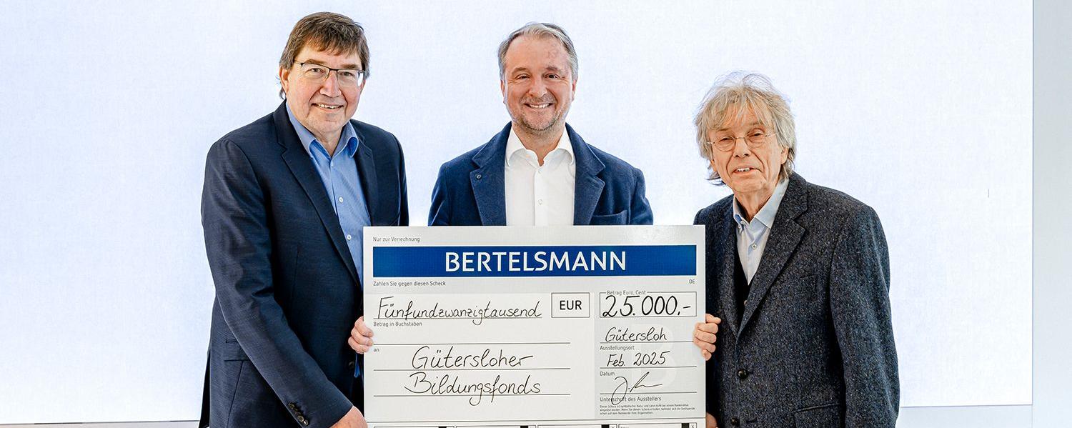 Dessen Projektleiter Ingo Kleinebekel zeigte sich zusammen mit Dr. Siegfried Bethlehem, Beiratsvorsitzender des Bildungsfonds, bei der Übergabe des symbolischen Schecks durch Bertelsmann-Personalvorstand Dr. Immanuel Hermreck hocherfreut über diese ebenso großzügige wie unerwartete Spende. Einerseits, so Kleinebekel, könne damit nahezu ein komplettes Jahresbudget des Bildungsfonds finanziert werden. Andererseits sei insbesondere vor dem Hintergrund der aktuellen Sparüberlegungen der Stadt Gütersloh mit steigenden Bedarfen, das heißt mit entsprechend mehr Anträgen zu rechnen. Zudem könnten sich noch zusätzliche Bedarfe aus dem seit Ende letzten Jahres erweiterten Unterstützungsangebot des Bildungsfonds, der sogenannten „Lernförderung in Kleingruppen“, ergeben. Lag der bisherige Schwerpunkt des Bildungsfonds überwiegend in der Unterstützung der Teilhabe, sollen mit diesem Angebot die Schulen insbesondere im Bereich der Sprach- und Lernkompetenz unterstützt werden. Auch dafür kommt die Spende genau zur rechten Zeit.