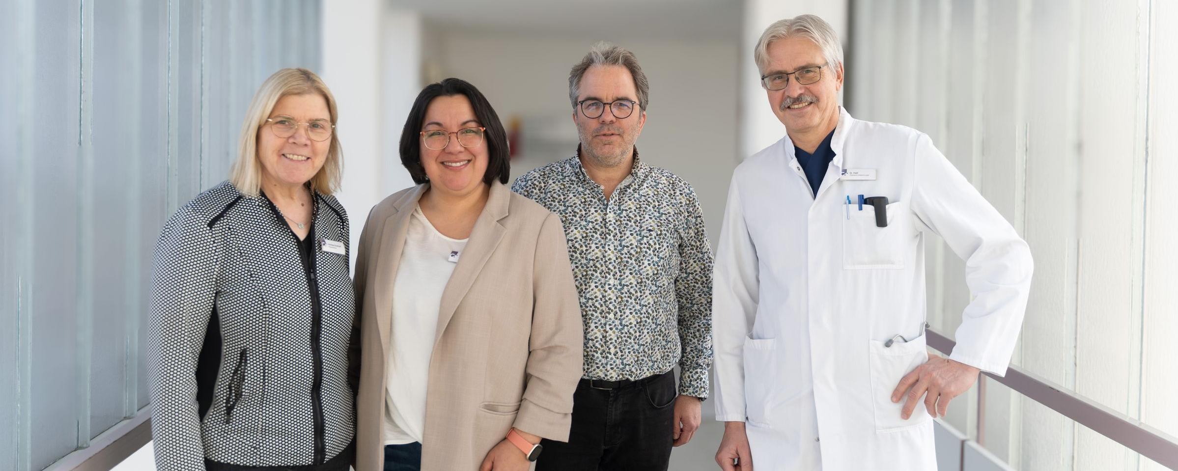 Menschen mit Demenz brauchen eine Umgebung, die auf ihre Bedürfnisse eingeht, auch wenn sie ins Krankenhaus müssen. Dafür machen sich Pflegedirektorin Andrea Eickhoff und Demenzkoordinatorin Nadine Lömker vom Klinikum Gütersloh, Bernd Meißnest (Ärztlicher Leiter der Klinik für Gerontopsychiatrie am LWL-Klinikum) sowie Gerald Hall, geschäftsführender Oberarzt der Klinik für Unfall- und Wiederherstellungschirurgie, stark.