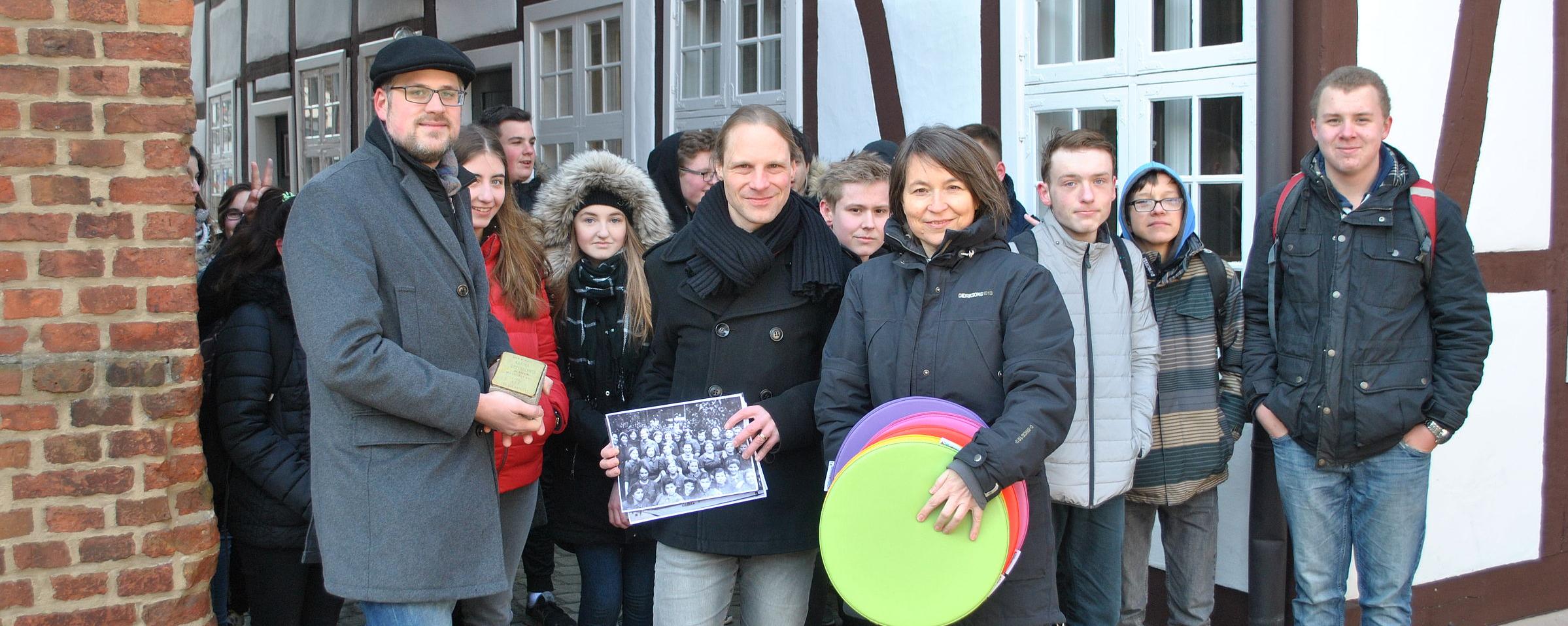 Ein Drittel des Zuschusses floss aber auch in das Konzept einer ersten „Stadt-Museums-Führung“, die Jungbluth zusammen mit dem Museumspädagogen Norbert Ellermann zum Thema Nationalsozialismus erarbeitet hat und derzeit als Pilotprojekt mit den 9. Klassen der Anne-Frank-Schule umsetzt. „Unsere Dauerausstellung zu dem Bereich wurde zwar grundlegend überarbeitet“, so Jungbluth. Trotzdem könne man auf den zehn Quadratmetern Fläche mit einer Schulklasse nicht allzu lange sinnvoll arbeiten. Die „Stadt-Museums-Führung“ kombiniert daher einen kurzen Prolog in der Ausstellung mit einem vertiefenden Vortrag im Museum und einer Stadtführung hin zu Stolpersteinen, Gedenktafeln und umbenannten Straßen. Ziel ist einerseits, dass die Schüler entdecken, dass Geschichte nicht nur im Museum, sondern in der ganzen Stadt gegenwärtig ist. „Andererseits sollen die Führungen zeigen, dass das Thema Nationalsozialismus nicht nur mit Berlin, München und Buchenwald verknüpft ist, sondern auch in Gütersloh Spuren hinterlassen hat“, so Michael Schüthuth, der an der Anne-Frank-Schule die Aktivitäten im Fach Gesellschaftslehre koordiniert. Nach den ersten drei „Stadt-Museums-Führungen“ scheint das Konzept aufzugehen. Wenn alle sechs Klassen das Programm durchlaufen haben, werden sich Museumsteam und Lehrkräfte noch einmal zusammensetzen, um die Erfahrungen auszuwerten. Spätestens nach den Sommerferien soll diese Stadt-Museums-Führung dann für alle Schulen zu buchen sein.