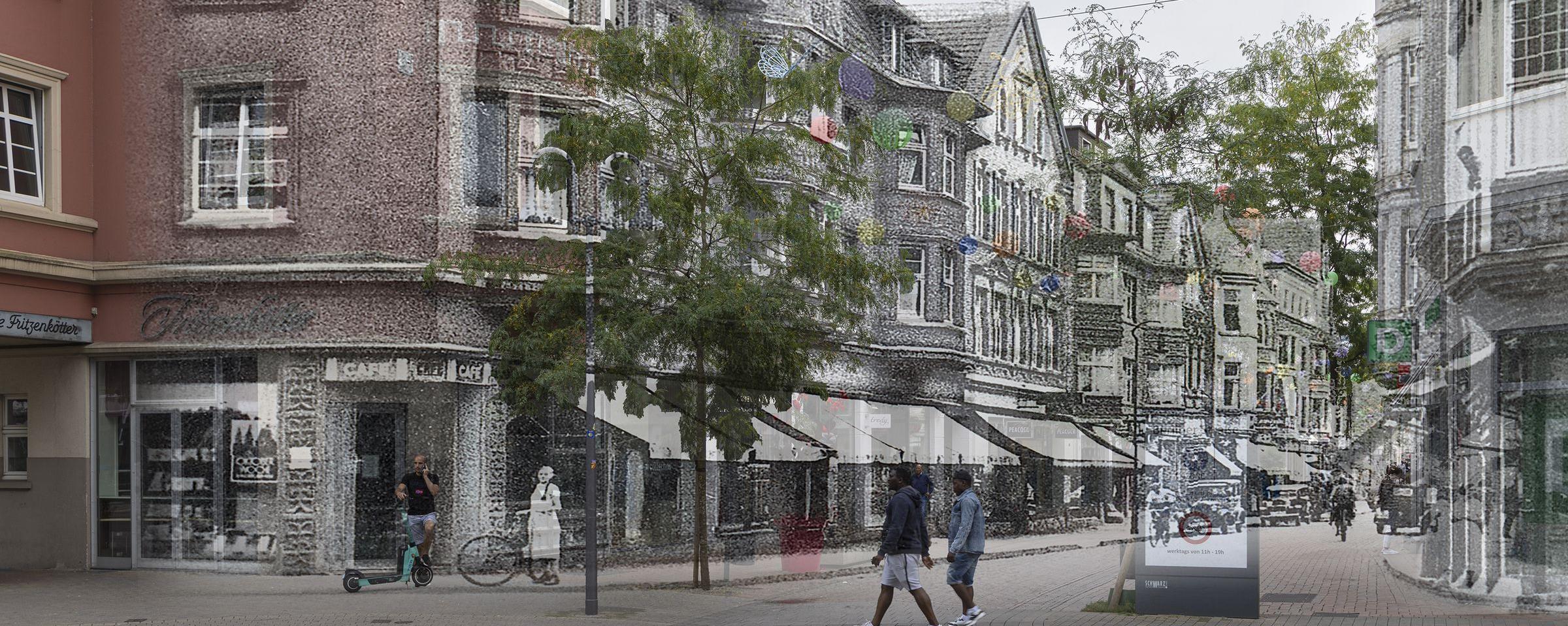 Es sind akribisch konzipierte Fotomontagen, die das alte mit dem aktuellen Gütersloh vereinen. Gut ein Jahr hat Bergemann an dieser Ausstellung gearbeitet. Zunächst recherchierte er im reichen Fundus des Stadtarchivs und suchte historische Bilder von markanten, seit langem existierenden Straßen und Plätzen in Gütersloh heraus. Orte mit sofortigem Wiedererkennungseffekt. Dann ist er mit seiner Kamera dahingezogen und hat aus gleicher Perspektive und Position zu unterschiedlichsten Tageszeiten ein neues Foto geschossen, um die beste Aufnahme passgenau über das historische Schwarz-Weiß-Motiv zu montieren. Wobei die neuen Fotos bewusst hauchzart und stark farbreduziert darübergelegt wurden, „damit das alte Bild nicht seine Wirkung verliert“, erklärt Siegmund Bergemann. Und so gesellt sich beispielsweise zur Dame, die 1957 ihr Rad für den Einkauf am Café Fritzenkötter an der Berliner Straße abstellt, ein neuzeitlicher Handy-Telefonierer mit E-Scooter, während im Hintergrund die am Straßenrand geparkten Oldtimer von moderner Straßendekoration überspannt werden. Die Bilder laden ein zu einer ebenso spannenden wie vergnüglichen Entdeckungstour.