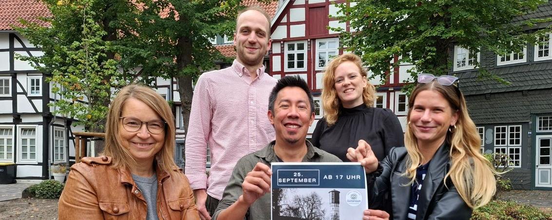 Foto: Laden ein zum Bandabend im Gütersloher Wasserturm: (vorn v. l.) Nina Spallek (Bürgerstiftung), Daniel Le-Van-Vo und Mona Stuckenbröker (Musikschule Kreis Gütersloh) sowie Jan Pohlmann und Lena Jeckel vom Fachbereich Kultur.