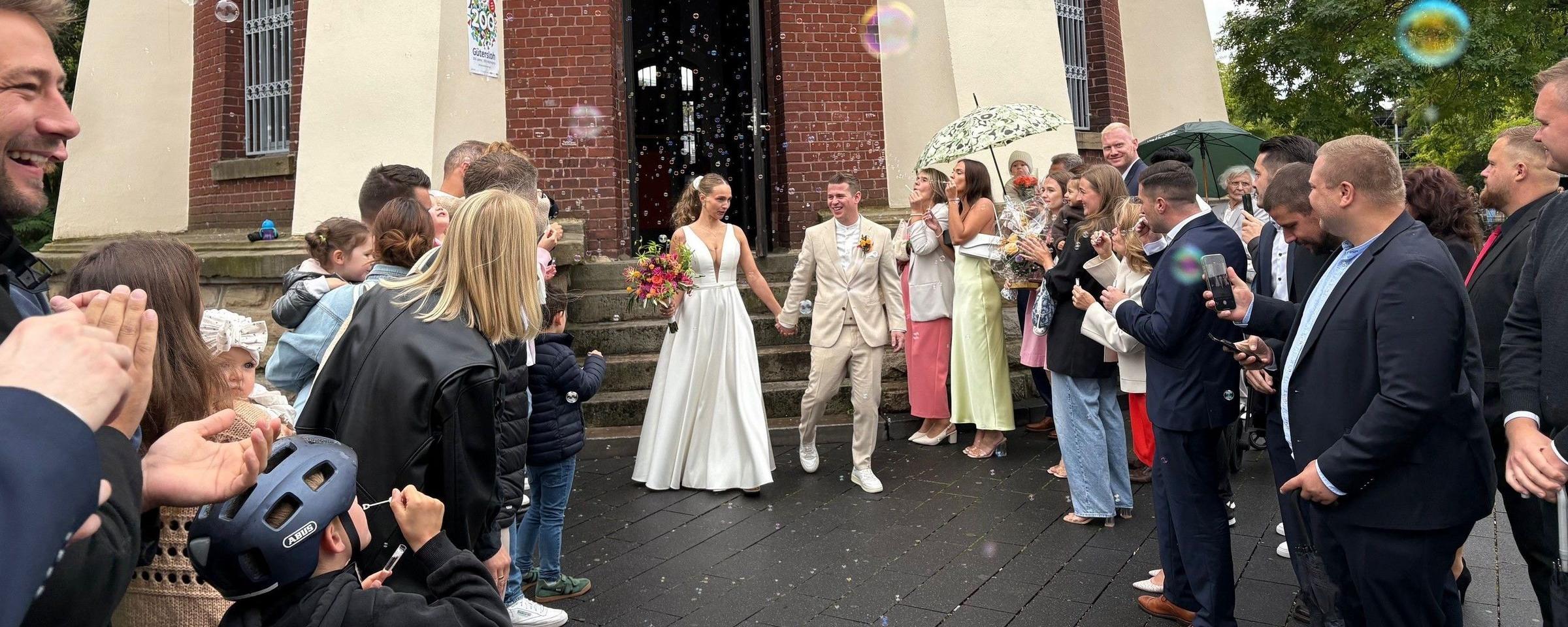 Getraut wurde an diesem Vormittag von 9 bis 13 Uhr - im Stundentakt. Gut gelaunt zeigte sich das Paar Tim und Isabel Tresch. Nach ihrer Trauung feierten beide noch ausgelassen weiter mit ihren Gästen vor dem Wasserturm.