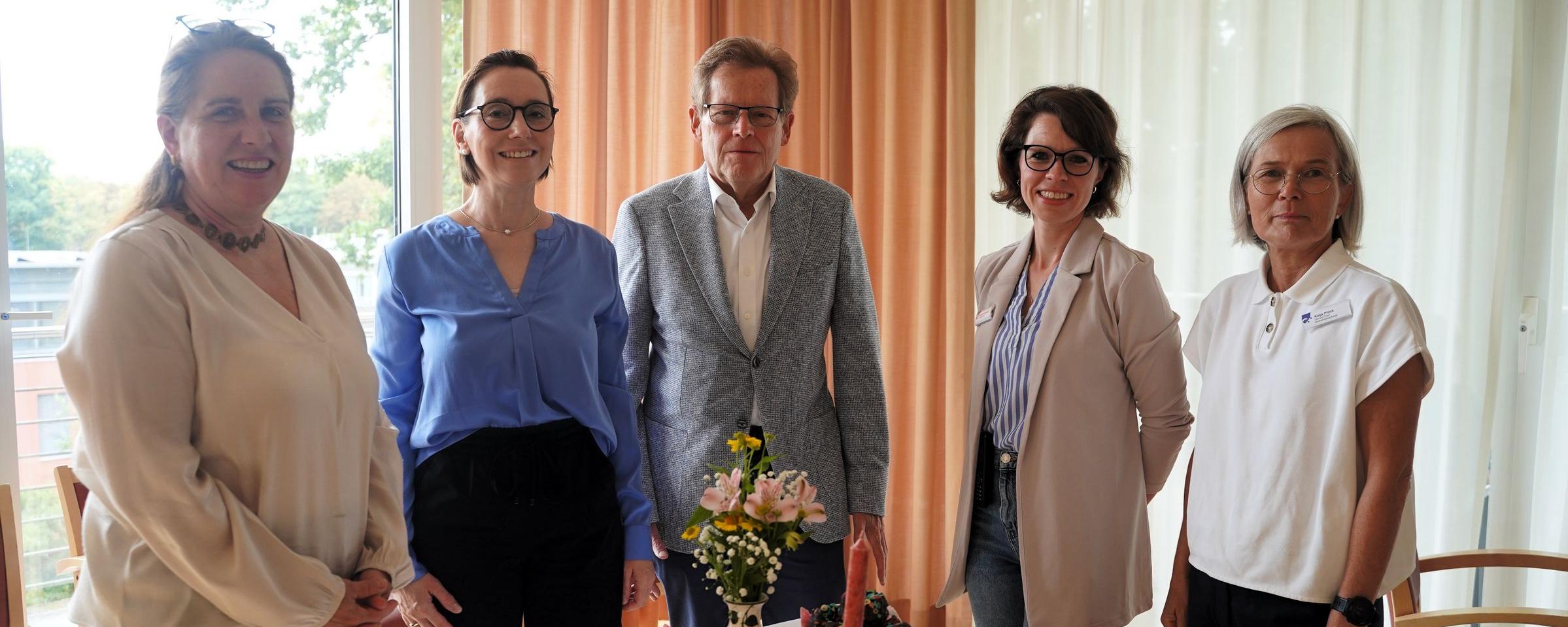 Projekt „Wohnzimmer“ im Klinikum Gütersloh. Mit dem innovativen Betreuungskonzept erweitert das Klinikum Gütersloh zusammen mit der Bürgerstiftung und der Erich und Katharina Zinkann-Stiftung sein Angebot für Menschen mit Demenz. (v.l. Maud Beste (Geschäftsführerin Klinikum Gütersloh), Katrin Meyer (Vorstandsvorsitzende der Bürgerstiftung Gütersloh), Bernd Mußenbrock (Vorstand Erich und Katharina Zinkann-Stiftung), Maike Lehmann (Pflegedirektion Klinikum Gütersloh), Katja Plock (Demenz-Coach am Klinikum Gütersloh).