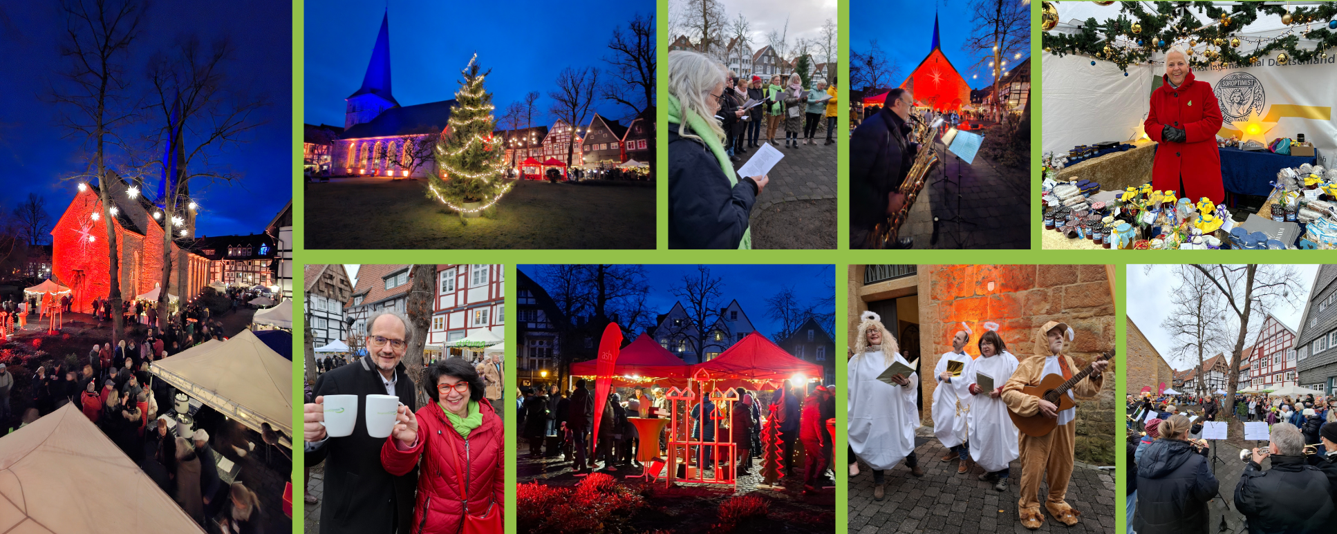 Je später es wurde, umso schöner erstrahlten die Apostelkirche und die umgebenden Fachwerkhäuser in ihrer Adventsbeleuchtung. Ein zauberhafter Rahmen für ein abwechslungsreiches Musikprogramm, das von dem wunderbar aufspielenden Posaunenchor Stadtmitte und dem Jugendmusikkorps Avenwedde, Ensembles der Kreismusikschule sowie der Schule für Musik und Kunst und nicht zu vergessen, einigen "Stimmbande"-Mitgliedern getragen wurde. Sie forderten zum Mitsingen von Weihnachtsliedern auf – was nur zu gern angenommen wurde. Ein tolles Miteinander, das für genau die richtige Vorweihnachtsstimmung sorgte.