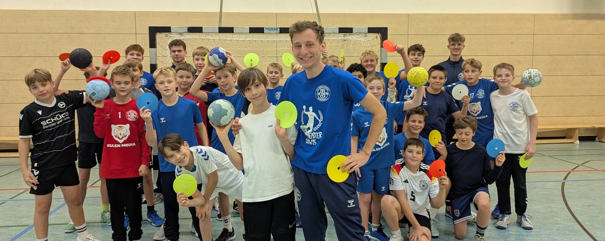 Es ist diese ganz besondere Mischung aus Schnelligkeit, körperlichem Einsatz und taktischem Geschick, die Handball für viele so faszinierend macht. Damit auch interessierte Grundschüler – ganz unabhängig von ihrem sozialen oder kulturellen Hintergrund – die Möglichkeit erhalten, diese Sportart kennenzulernen, fördert der Kinder- und Jugendbeirat (KiJu)der Bürgerstiftung Gütersloh ein neues Handball-Projekt des TV Isselhorst mit 1100 Euro. Mit dem Geld konnten die Startkosten gedeckt und – von Handbällen über Leibchen und Hütchen bis hin zum Eiskoffer – alle notwendigen Materialien gekauft werden, die den jungen Sportlern eine gute und sichere Grundlage fürs Training garantieren. Im Beisein vom KiJu-Mitglied Luk Rhenau wurden sie jetzt von der D-Jugend des Vereins präsentiert.