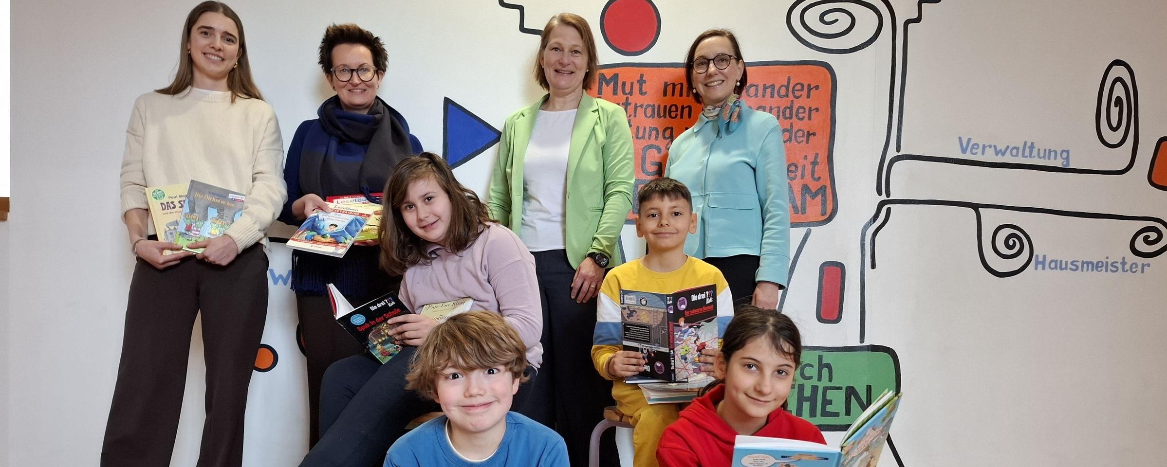 Erfolgsgeschichte mit vielen Kapiteln: (vorn v. l.) Max, Alba, Nicolas und Iasmin aus der Wolfsklasse freuen sich, dass die Hundertwasser-Schule das „Lies mit“- Projekt fest etabliert hat. Hinten (v. l.) Lehrerin Sophie Uschmann, Schulleiterin Heyka Hübner, Anika Krumhöfner, Projektmanagerin vom Zentrum für Bildung und Chancen im Kreis Gütersloh, und Katrin Meyer, Vorstandsvorsitzende der Bürgerstiftung Gütersloh.
