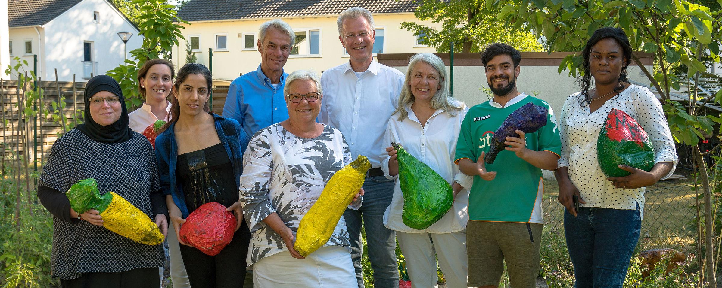 Der Gemeinschaftsgarten der Parsevalsiedlung, ebenfalls gefördert vom Spendenfonds, trägt sichtbar Früchte und ist zu einer Begegnungsstätte für Groß und insbesondere Klein geworden. Mit Begeisterung sind die etwa 40 Kinder der Siedlung an den heißen Sommertagen dabei gewesen, „ihre“ Pflanzen zu retten und regelmäßig zu bewässern, und die selbstangelegten Beete durch große gebastelte Obst- und Gemüsefiguren zu markieren. Eins von vielen Beispielen, das zeigt, wie Ankommen und Integration, auch gefördert durch den Spendenfonds „Engagement für Flüchtlinge“, klappen kann.