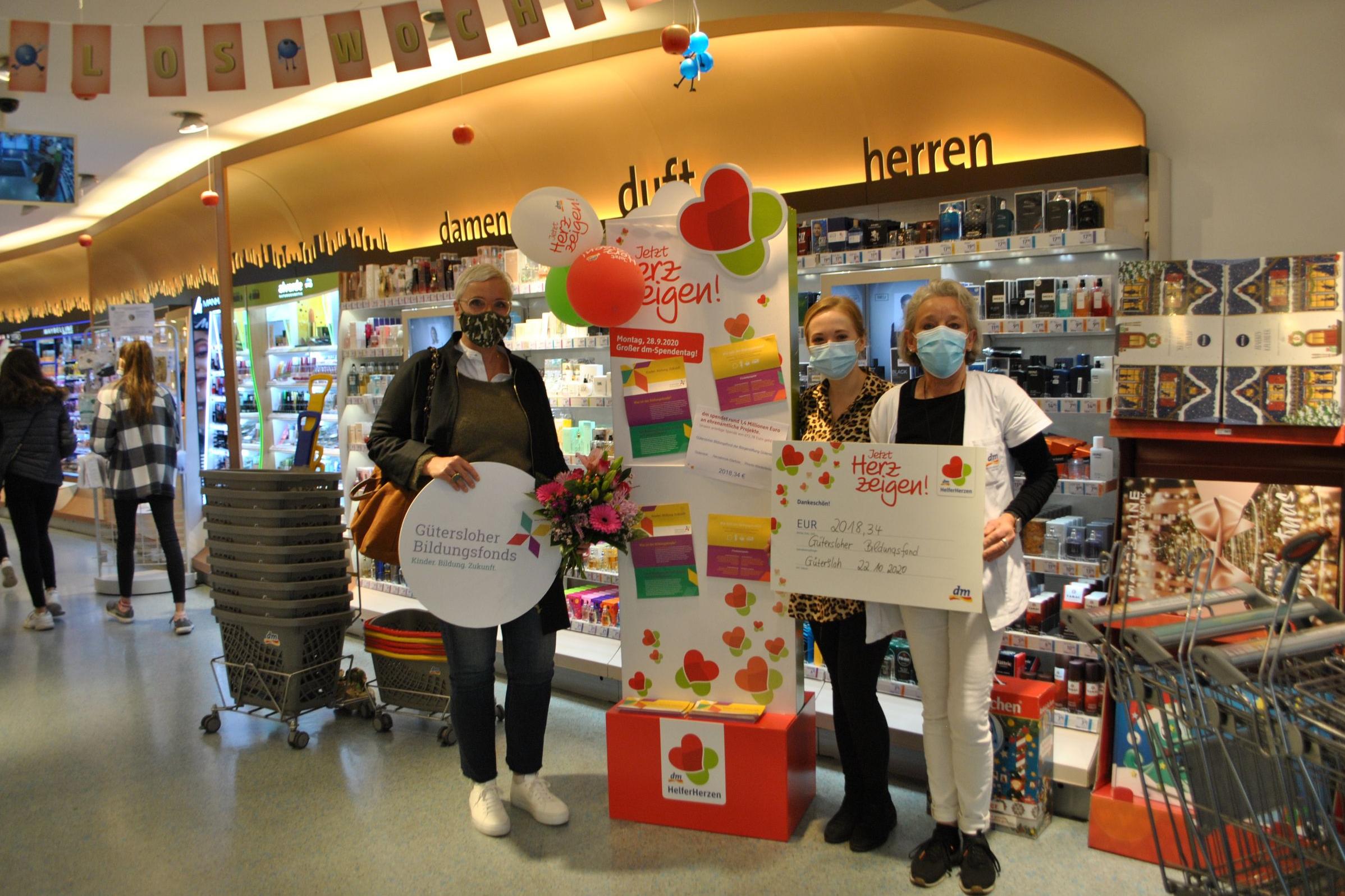 Fünf Prozent der Tageseinnahmen der dm-Filialen in Gütersloh, Rheda und Herzebrock-Clarholz, insgesamt 2.018,34 €, kommen bei der Aktion HelferHerzen zusammen.