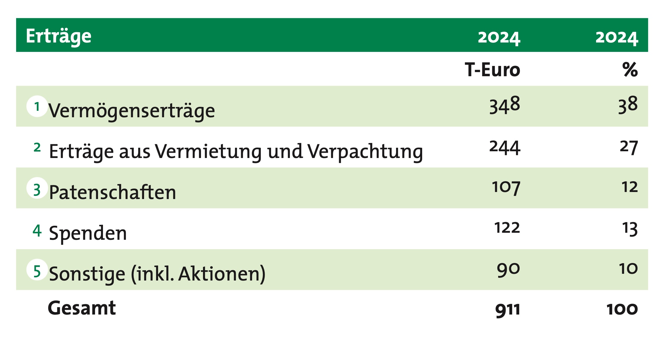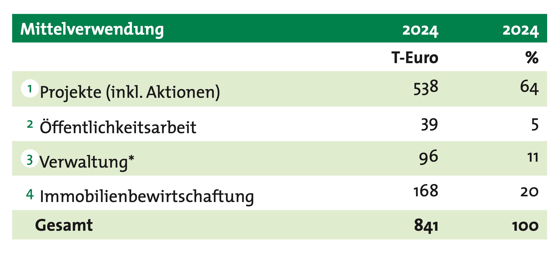 Die Projektrücklagen für bereits genehmigte Projektzusagen der kommenden Jahre (inkl. nicht verbrauchter zweckgebundener Spenden) betragen 503 T-Euro (Vorjahr: 498 T-Euro). Die freien Rücklagen sind auf 1.034 T-Euro (Vorjahr: 945 T-Euro) gestiegen.