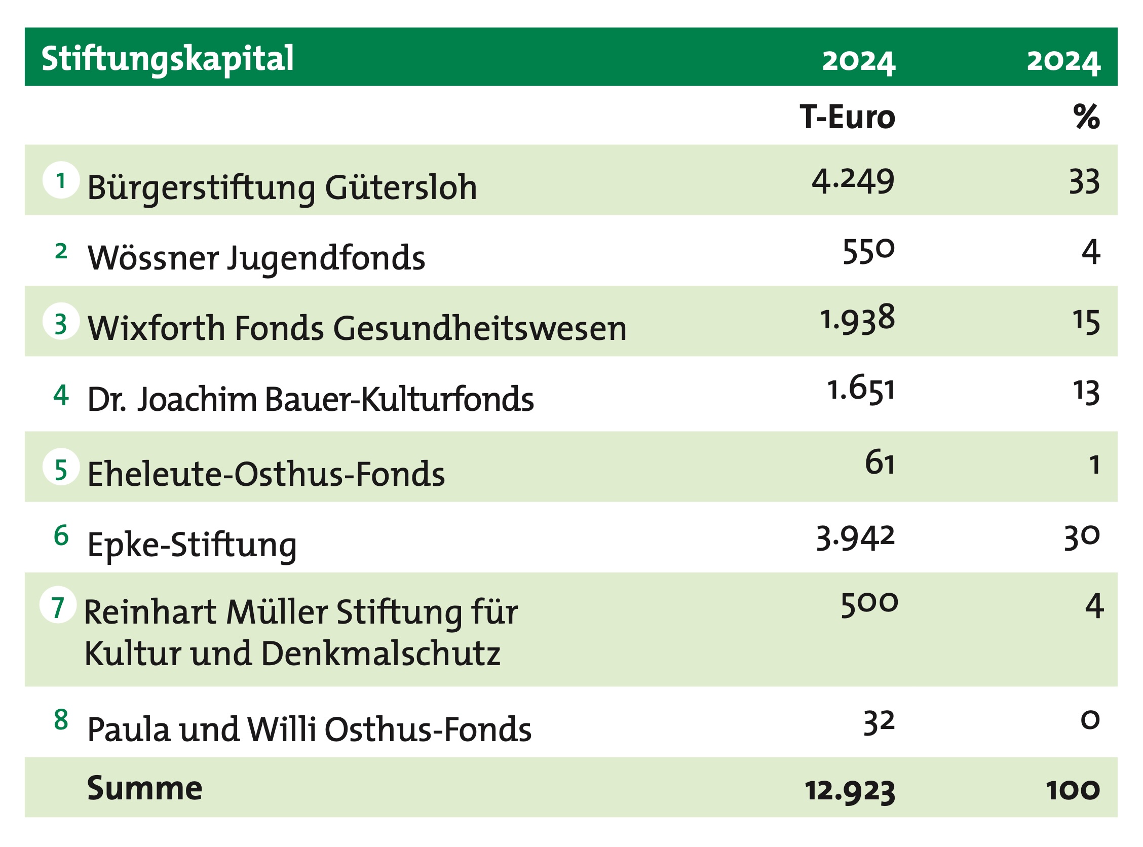Das Stiftungskapital der Bürgerstiftung Gütersloh und ihrer Treuhandstiftungen hat zum 31. Dezember 2024 in Summe 12.923 T-Euro betragen. Damit hat sich das gesamte Stiftungskapital im Vergleichzum Vorjahr um 238 T-Euro erhöht. Im Stiftungskapital der Bürgerstiftung sind u.a. folgende zweckgebundenen Zustiftungen enthalten: der Jacobi Bildungsfonds mit 76 T-Euro, der Dieter Heimer-Fonds mit 500 T-Euro, der Fonds der Eheleute Wulfhorst mit 864 T-Euro, der Thorsten Wixforth Leukämiefonds mit 262 T-Euro, der Allwermann Sozialfonds mit 292 T-Euro.